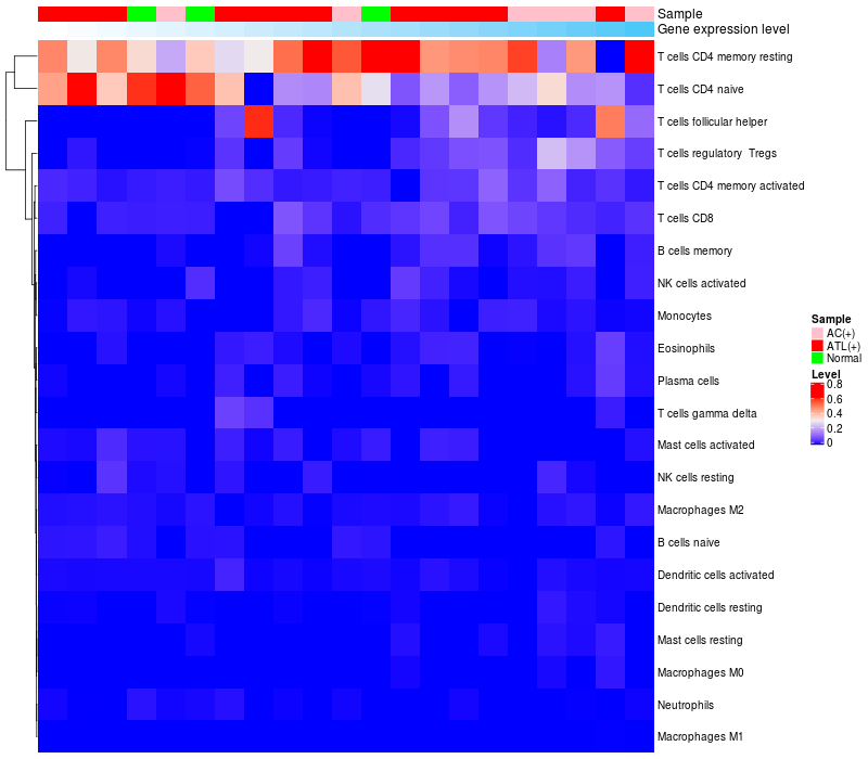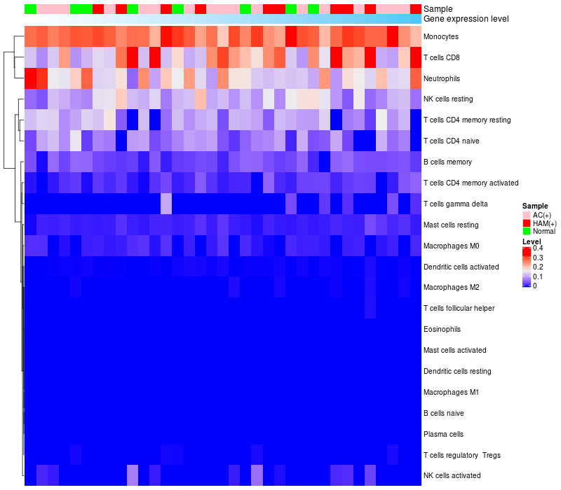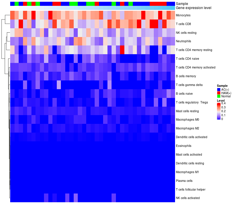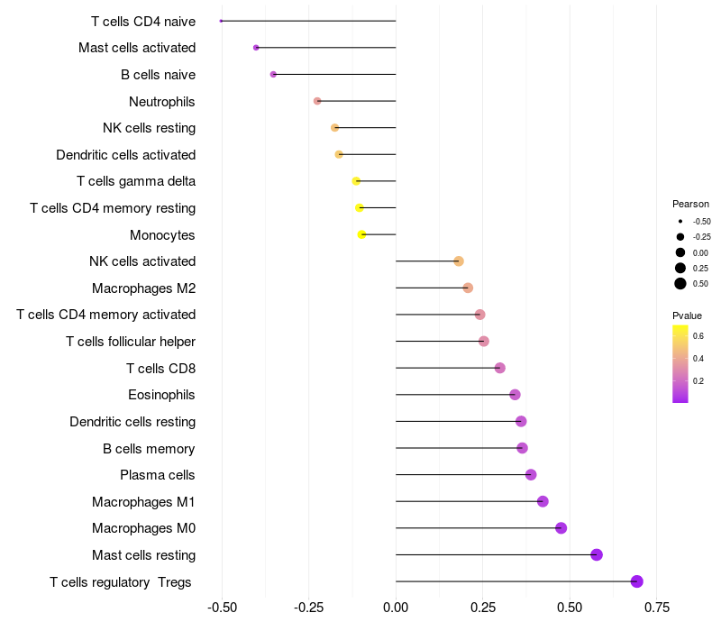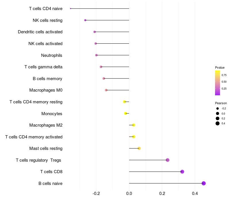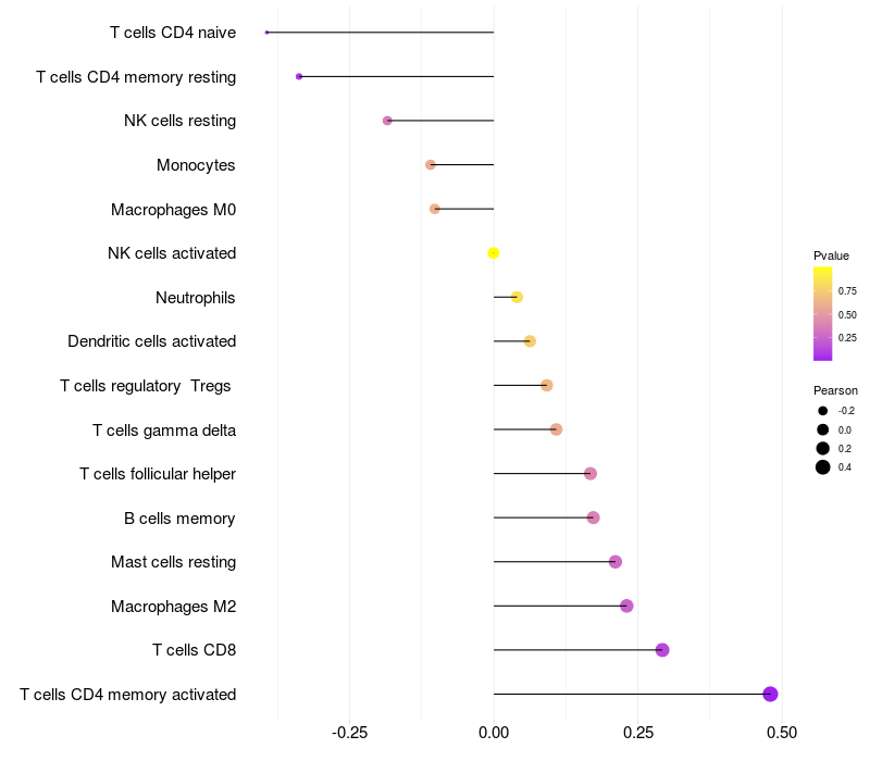 Lollipop of ASPHD2 expression and immune infiltrating cell level correlation result in HTLV1+ samples