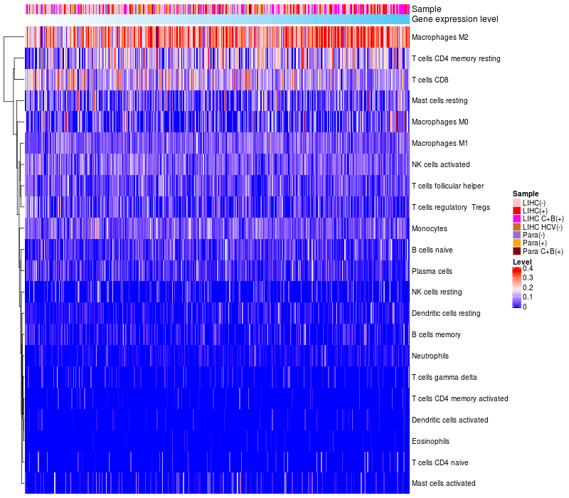 Liver hepatocellular carcinoma HCV (HBV+)(86), Liver hepatocellular carcinoma HCV (HBV-)(19), Liver hepatocellular carcinoma (HBV+)(209), Liver hepatocellular carcinoma (HBV+)(60), Paracancerous HCV (HBV+)(4), Paracancerous (HBV-)(28), Paracancerous (HBV+)(18) |