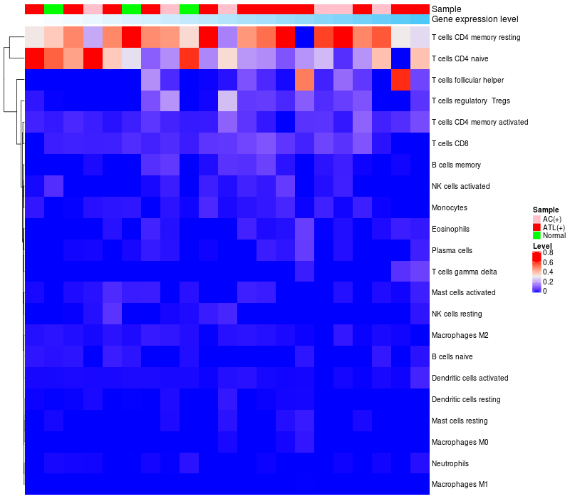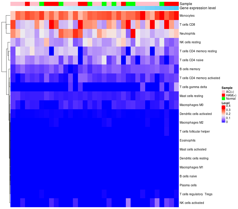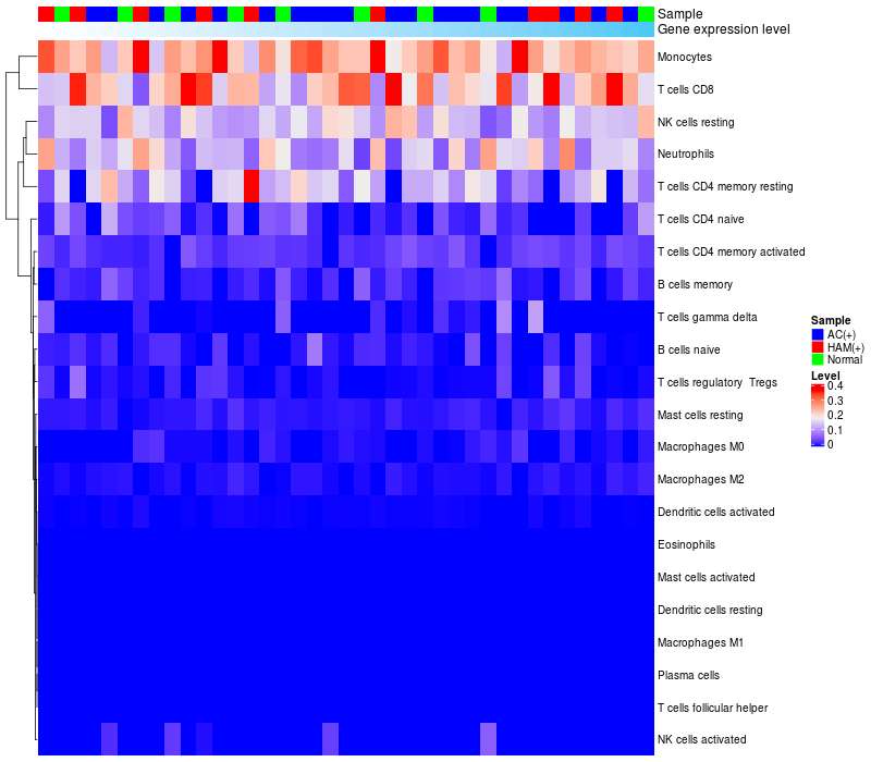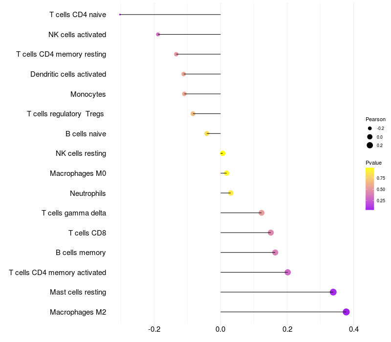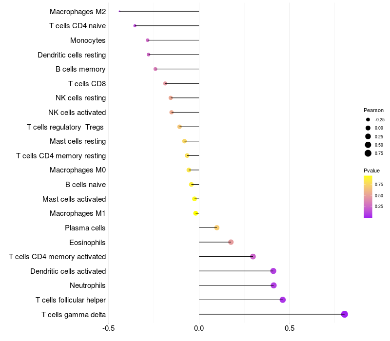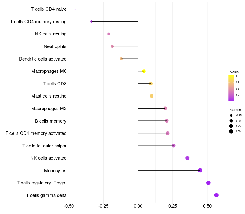 Lollipop of ATP6V1D expression and immune infiltrating cell level correlation result in HTLV1+ samples