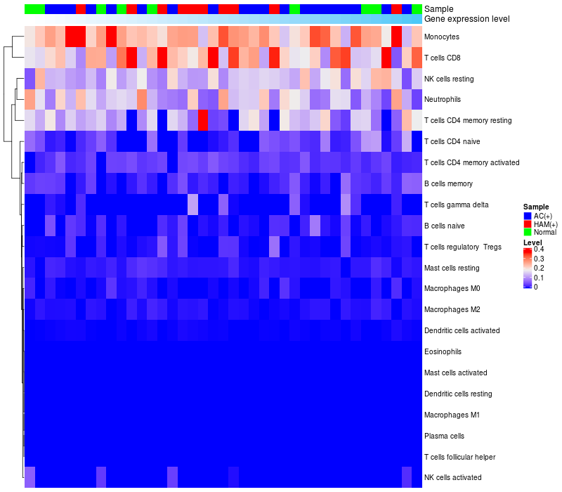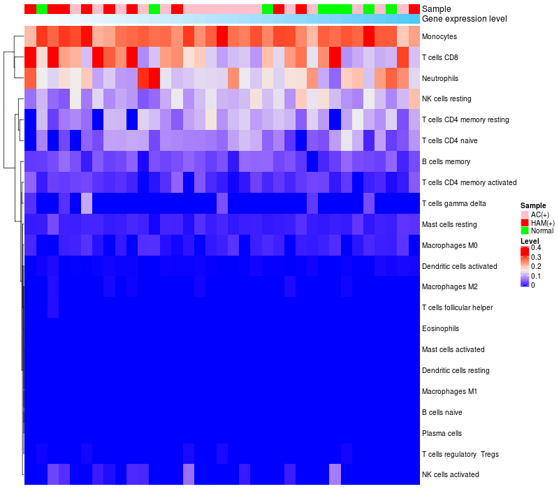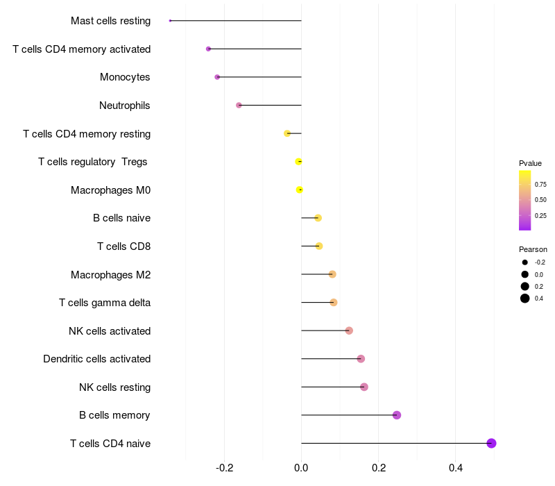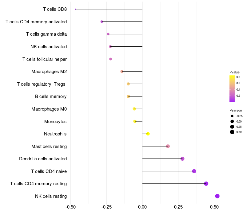 Lollipop of ATXN8OS expression and immune infiltrating cell level correlation result in HTLV1+ samples