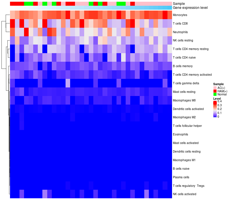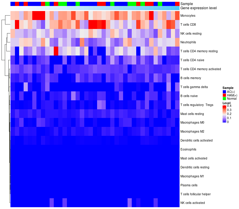 Normal (8), Asymptomatic carriers (HTLV1+)(17), HTLV-1-associated myelopathy (HTLV1+)(10) |