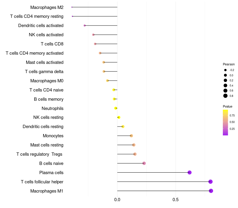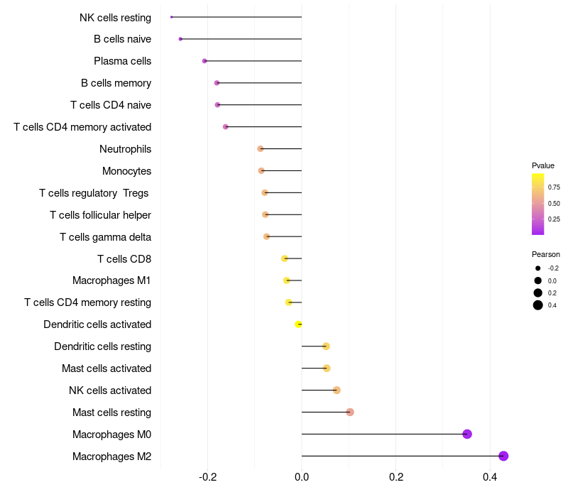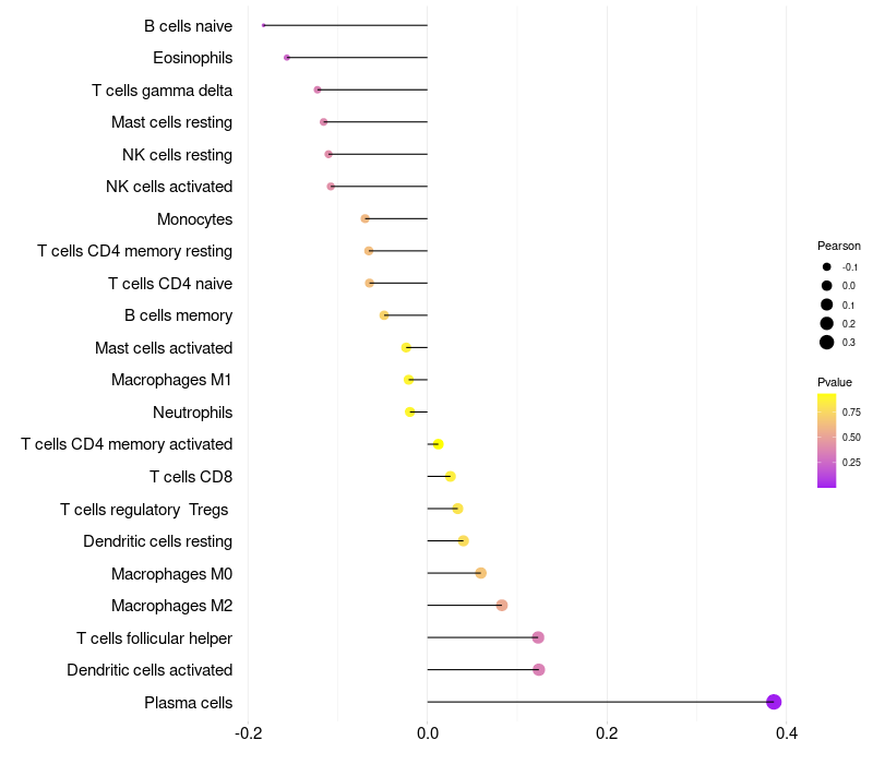 Lollipop of B3GNT9 expression and immune infiltrating cell level correlation result in HPV+ samples