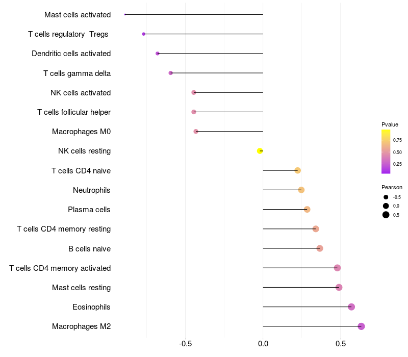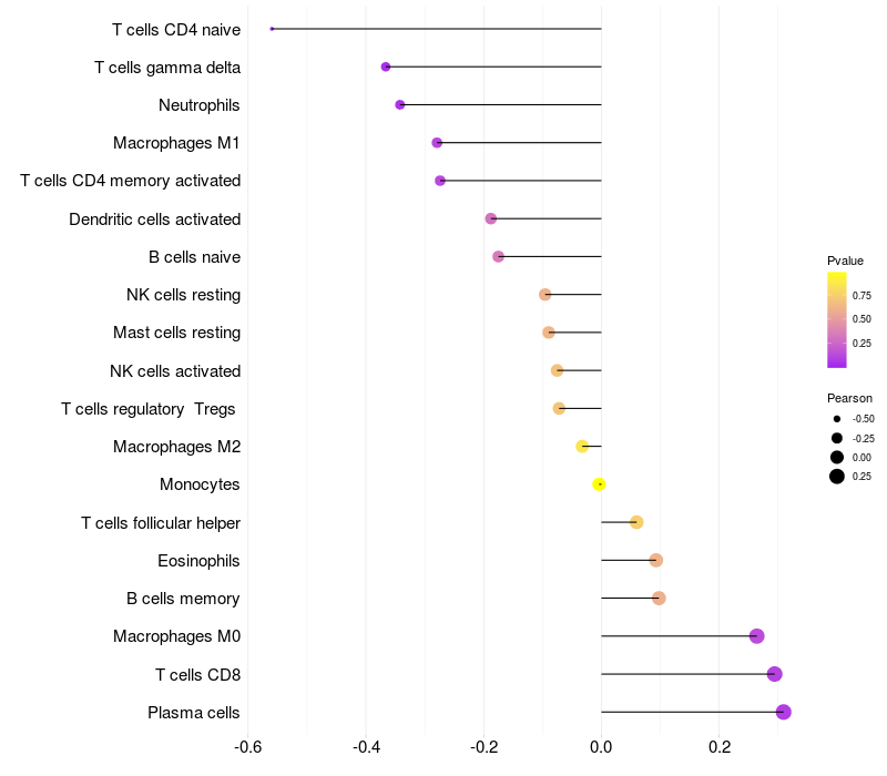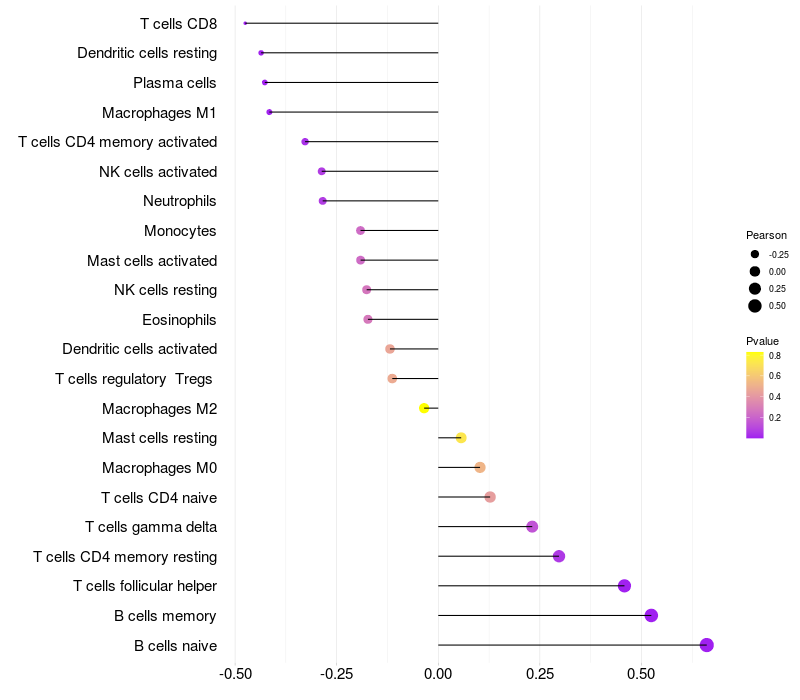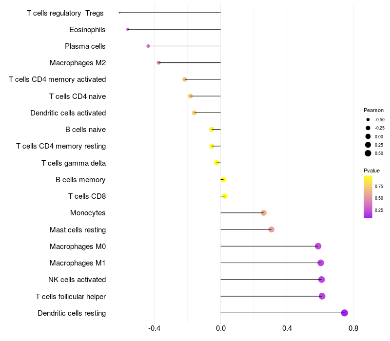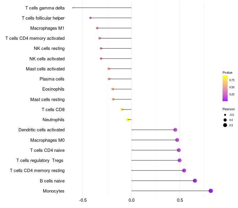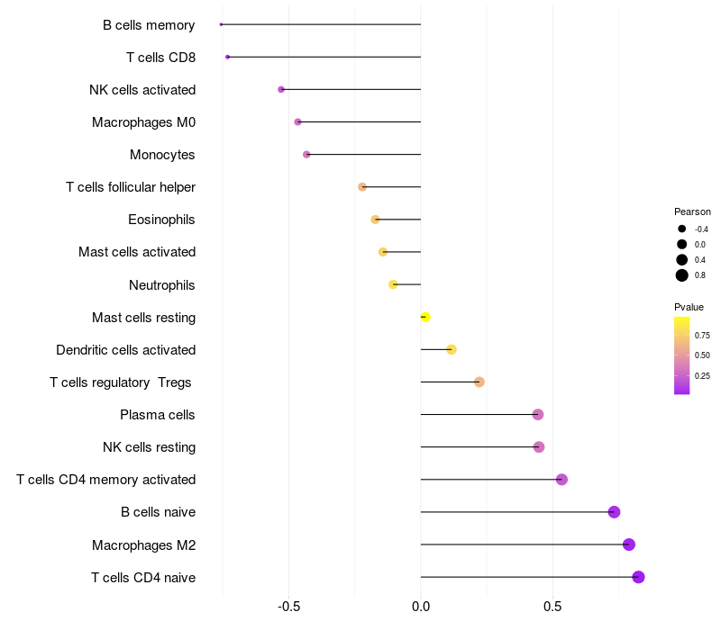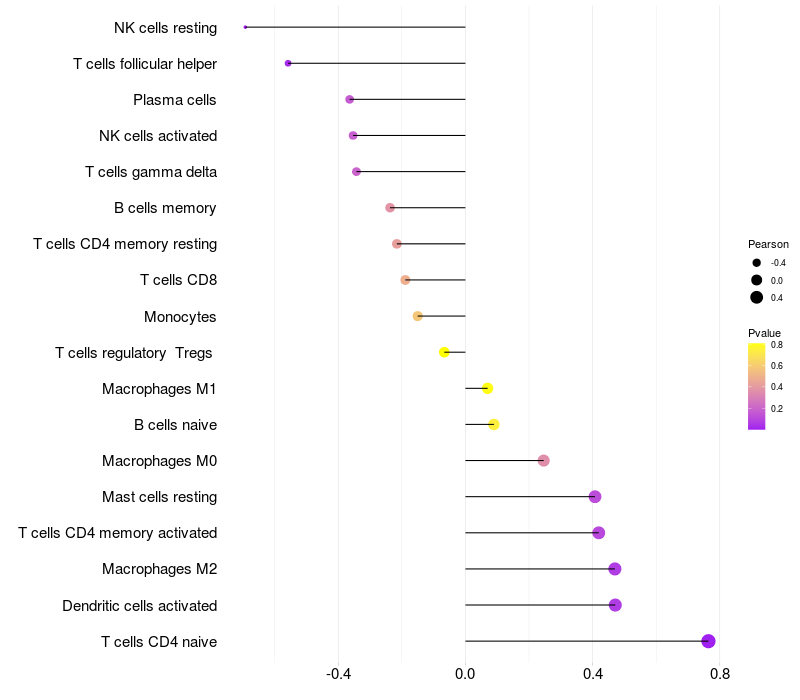 Lollipop of BACH2 expression and immune infiltrating cell level correlation result in EBV+ samples