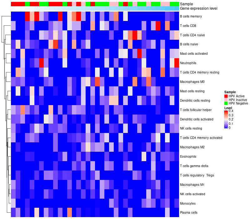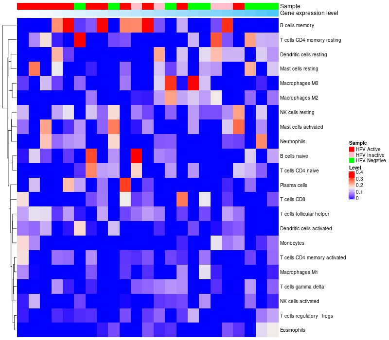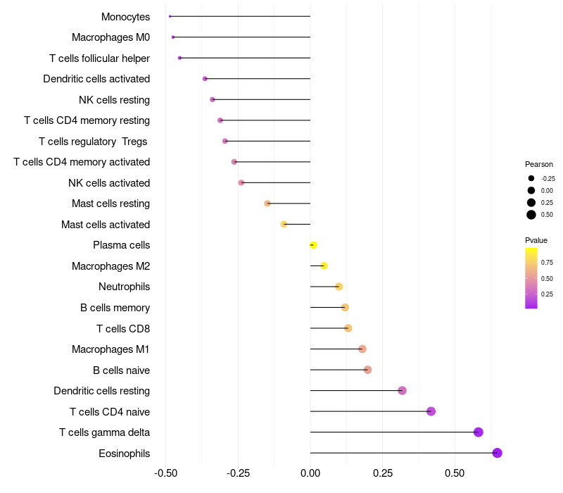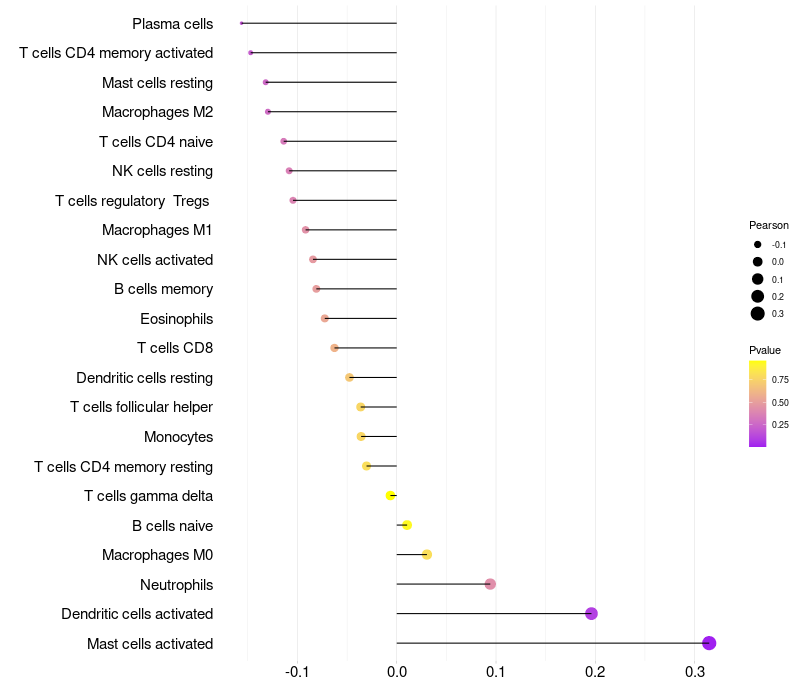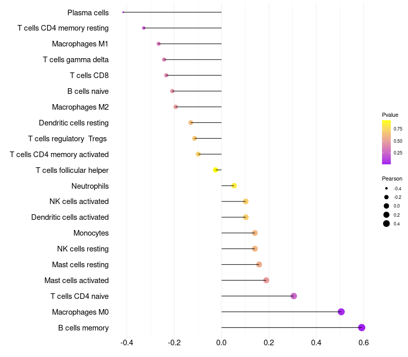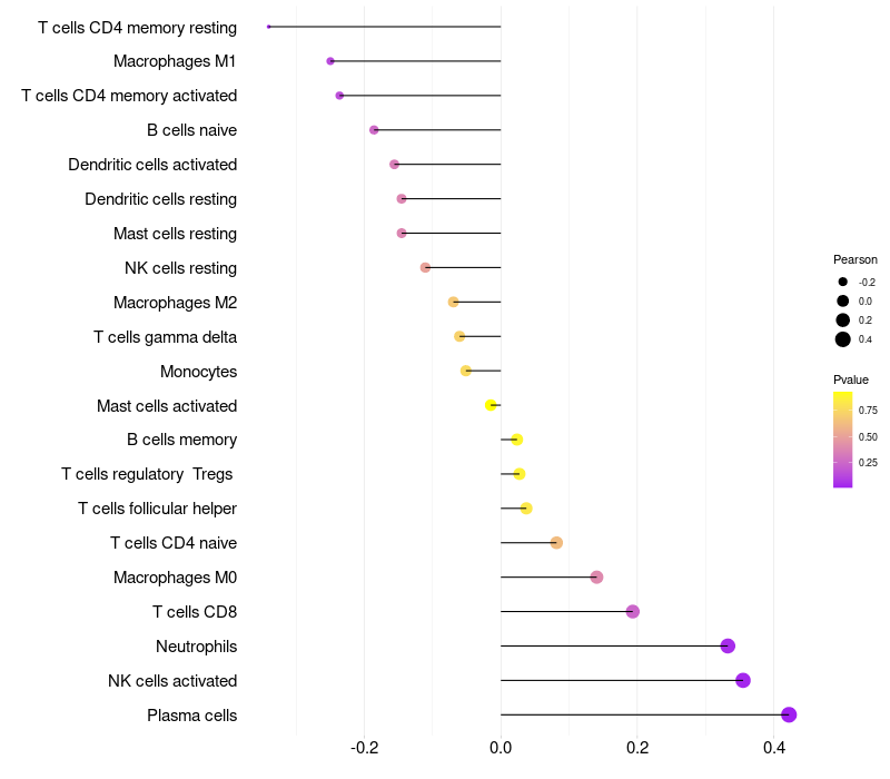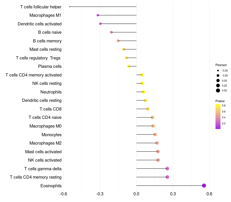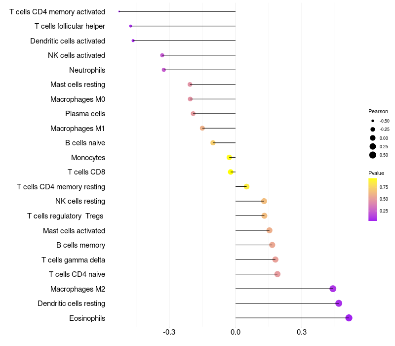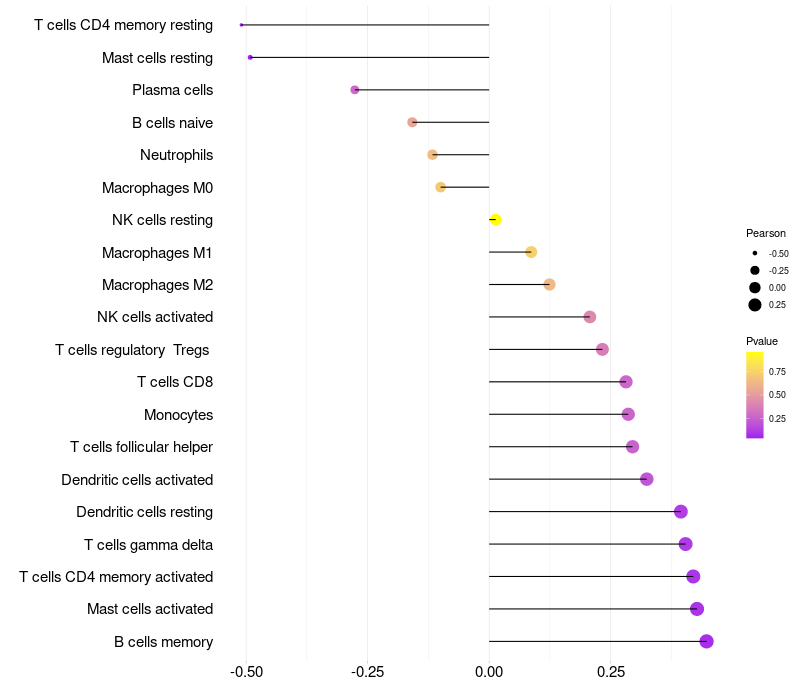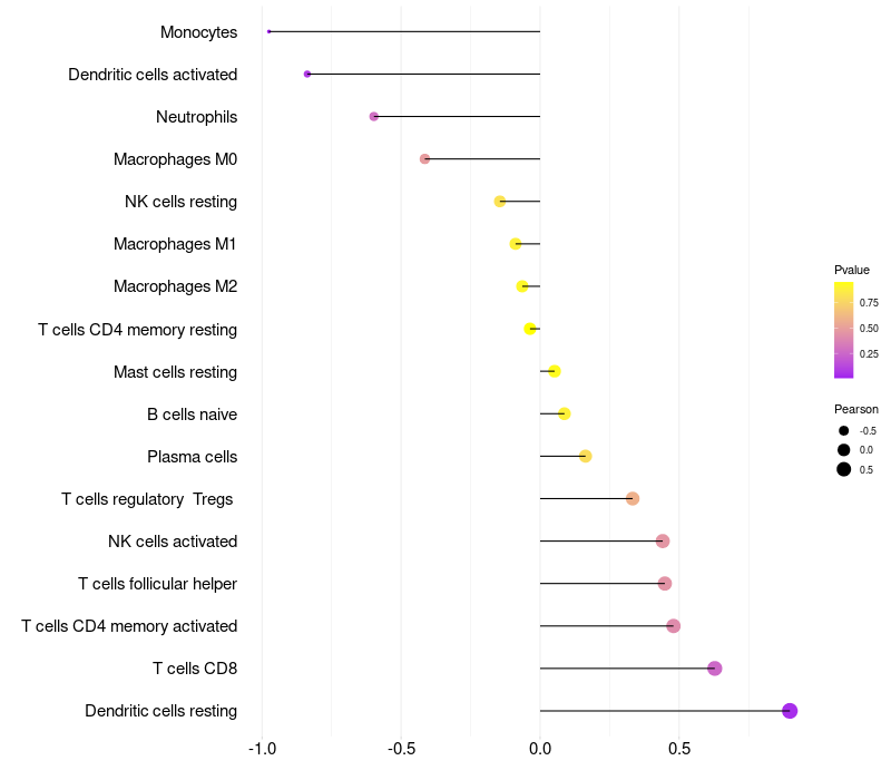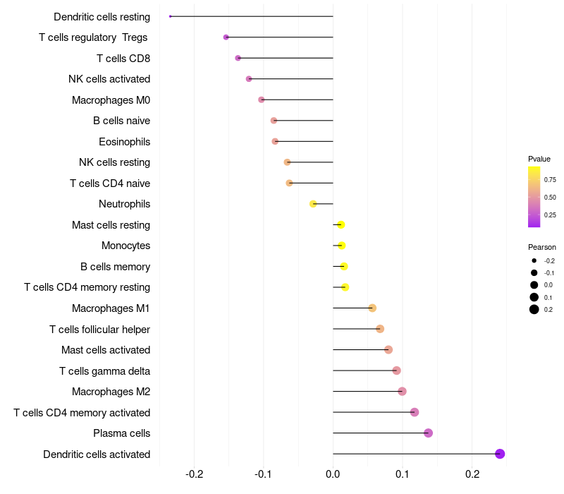 Lollipop of BCL7C expression and immune infiltrating cell level correlation result in HPV+ samples