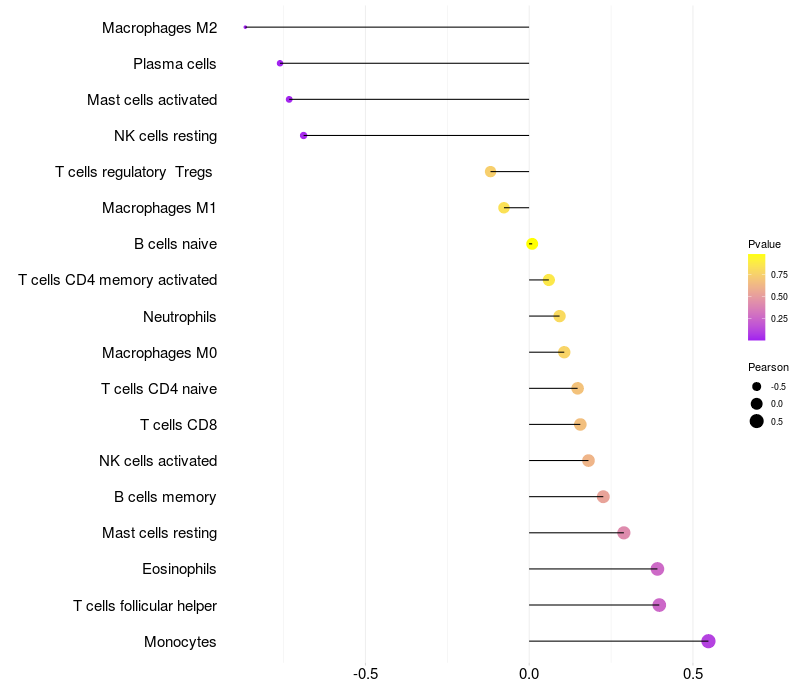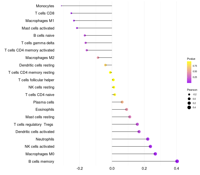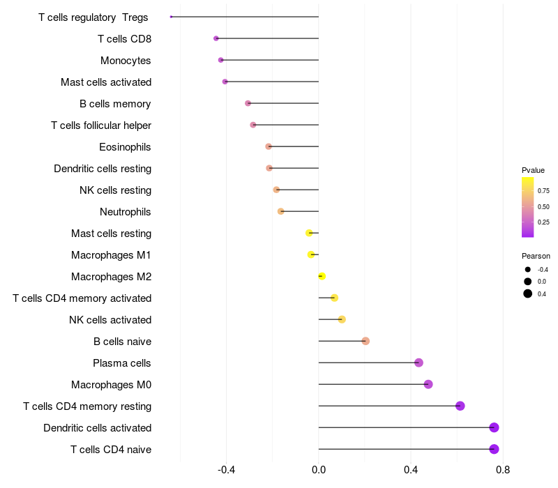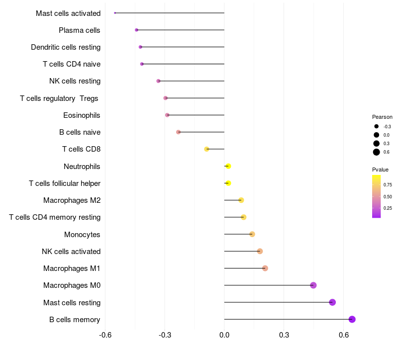 Lollipop of BET1L expression and immune infiltrating cell level correlation result in HBV+ Liver cirrhosis samples
