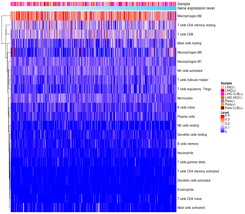 Liver hepatocellular carcinoma HCV (HBV+)(86), Liver hepatocellular carcinoma HCV (HBV-)(19), Liver hepatocellular carcinoma (HBV+)(209), Liver hepatocellular carcinoma (HBV+)(60), Paracancerous HCV (HBV+)(4), Paracancerous (HBV-)(28), Paracancerous (HBV+)(18) |