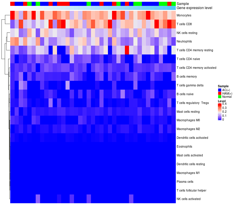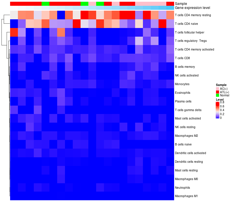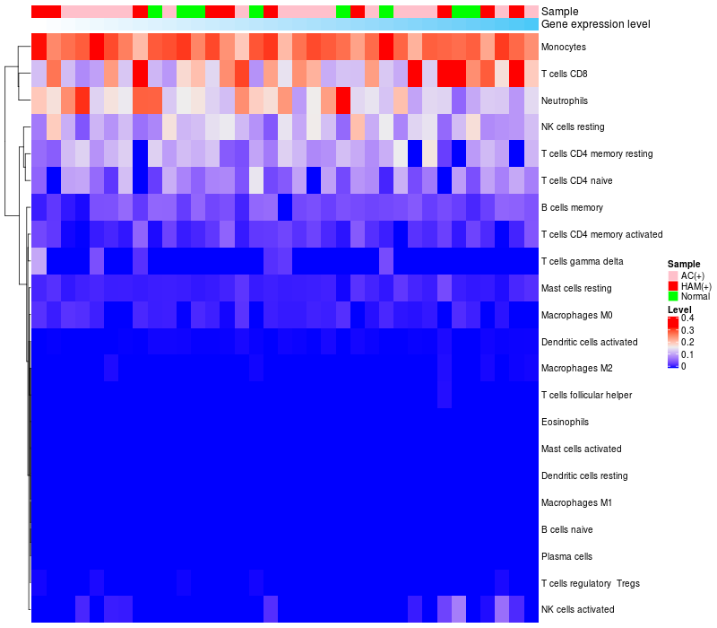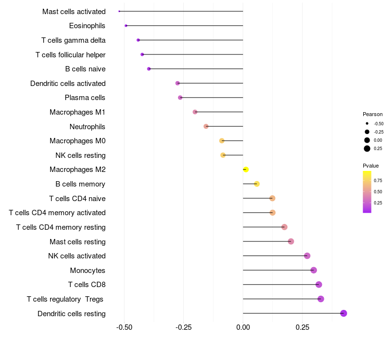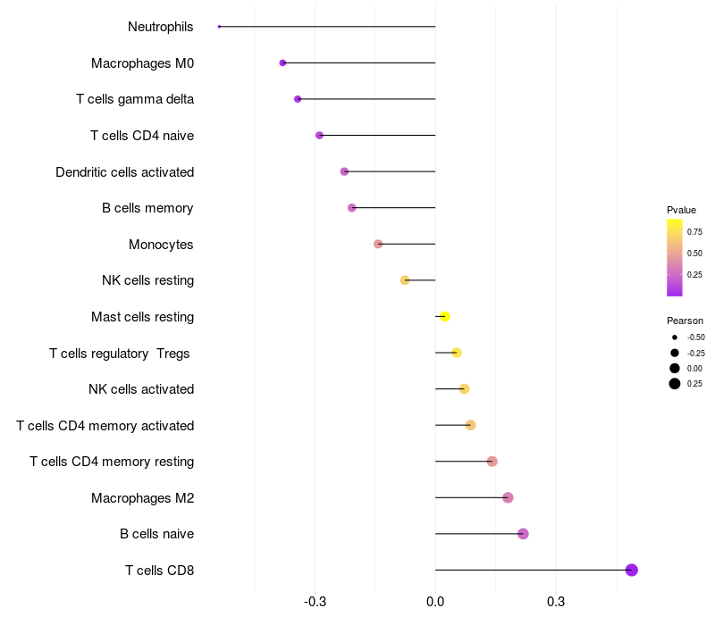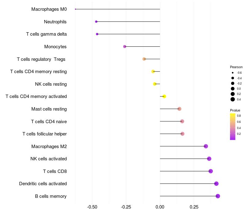 Lollipop of BFAR expression and immune infiltrating cell level correlation result in HTLV1+ samples