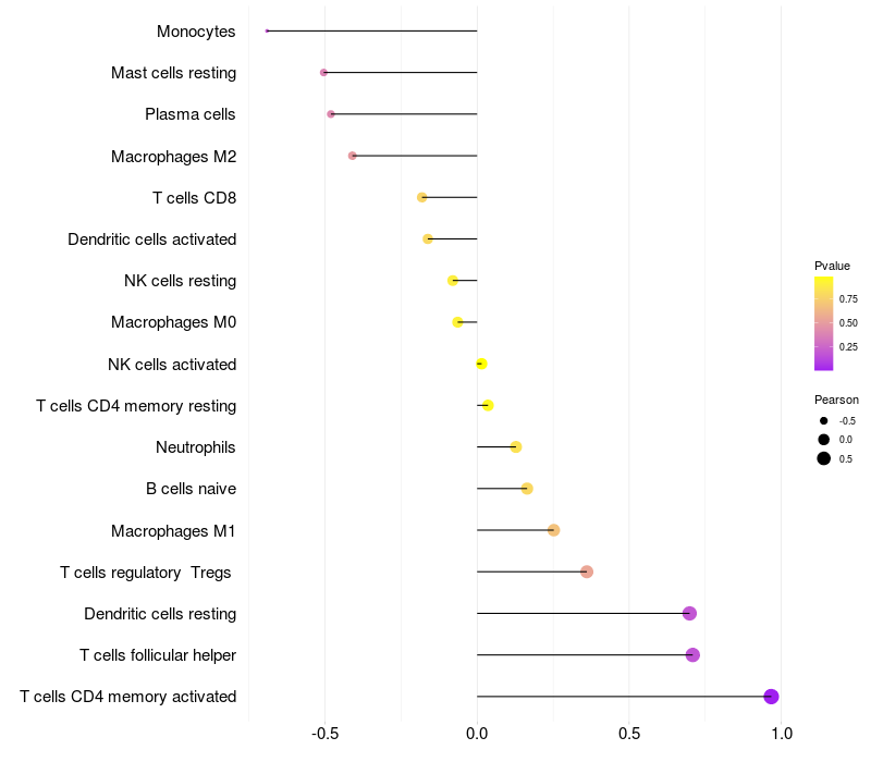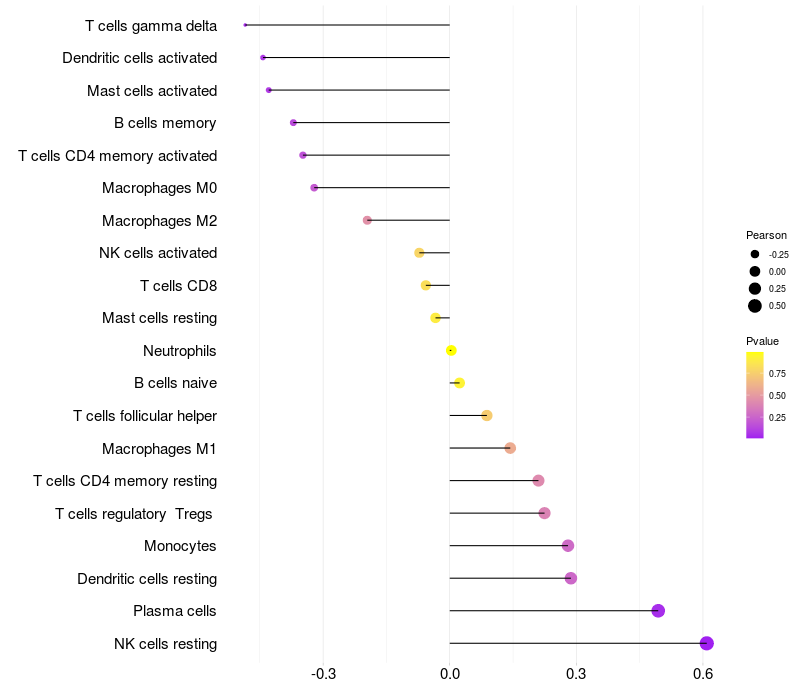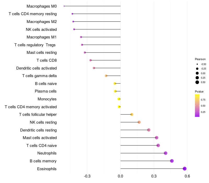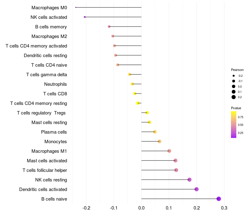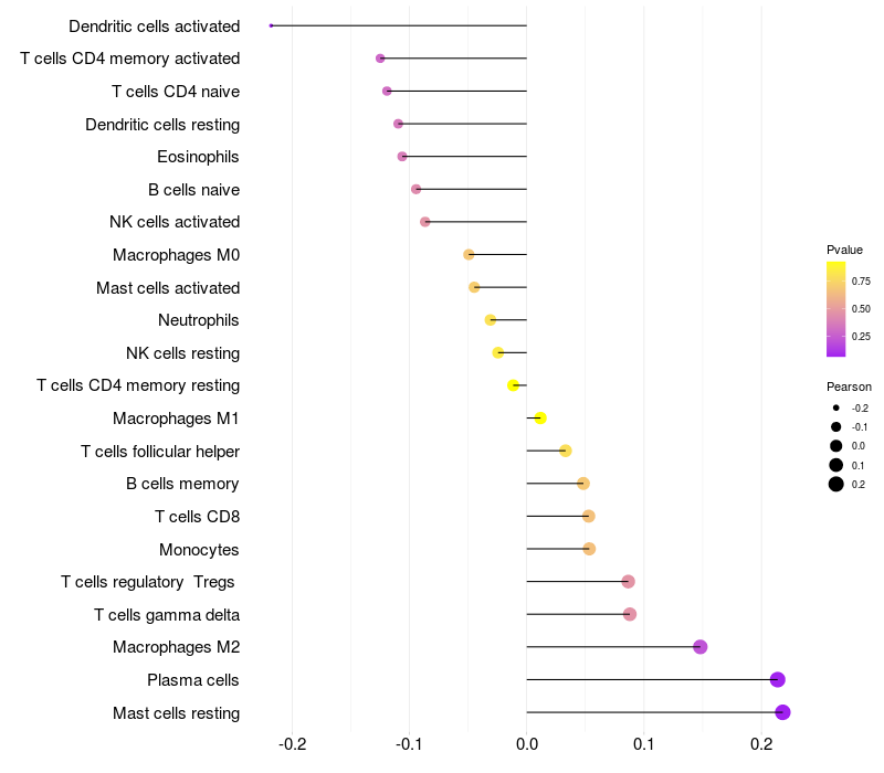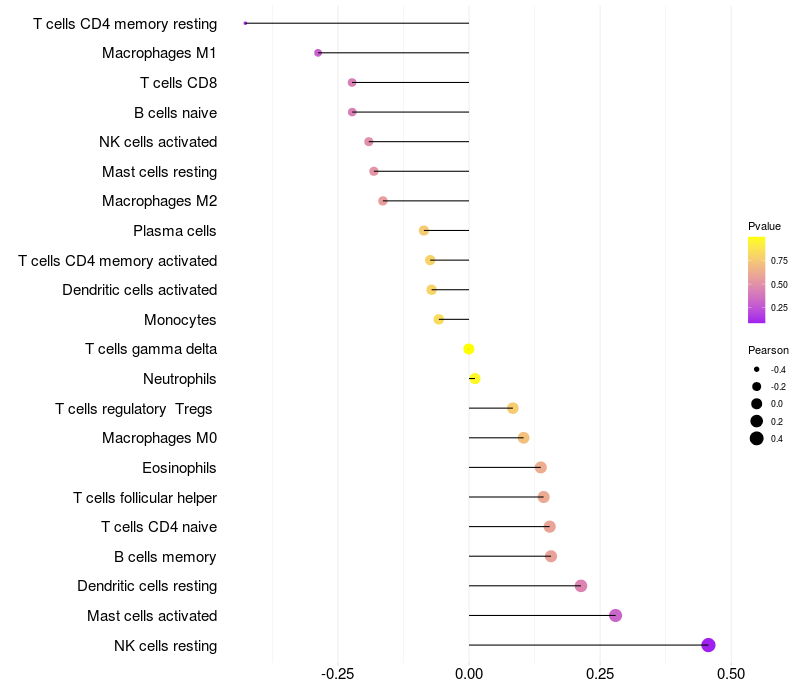 Lollipop of BMP3 expression and immune infiltrating cell level correlation result in HPV+ samples