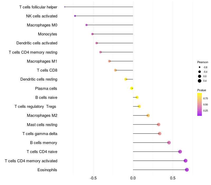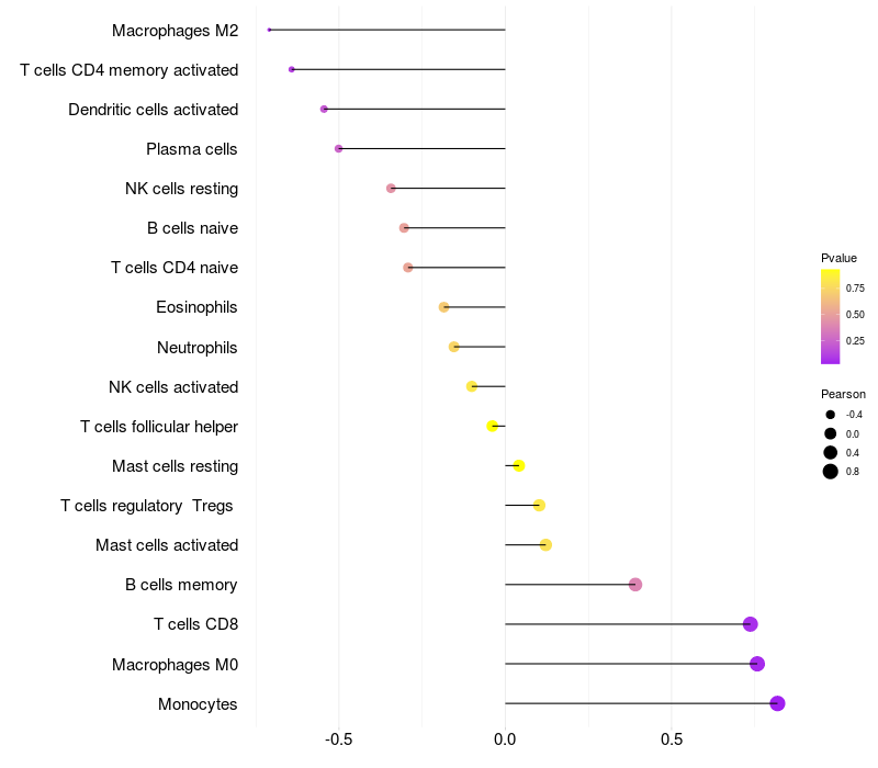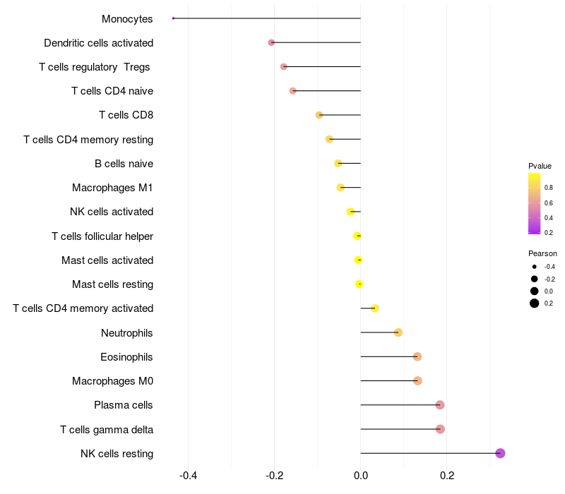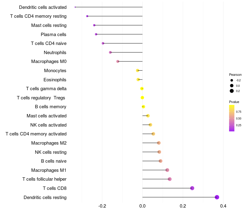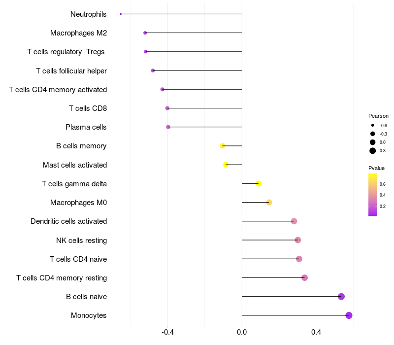 Lollipop of BPIFC expression and immune infiltrating cell level correlation result in EBV+ samples