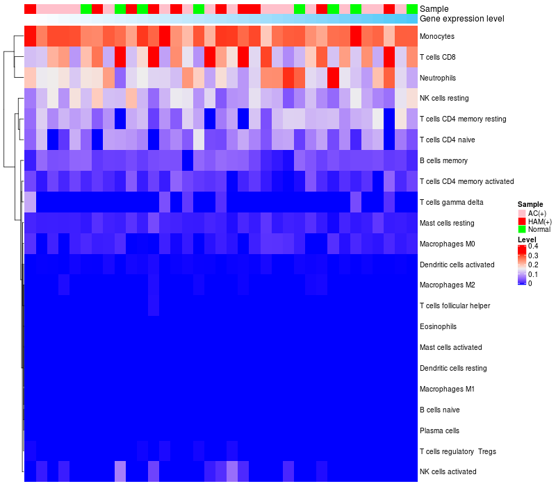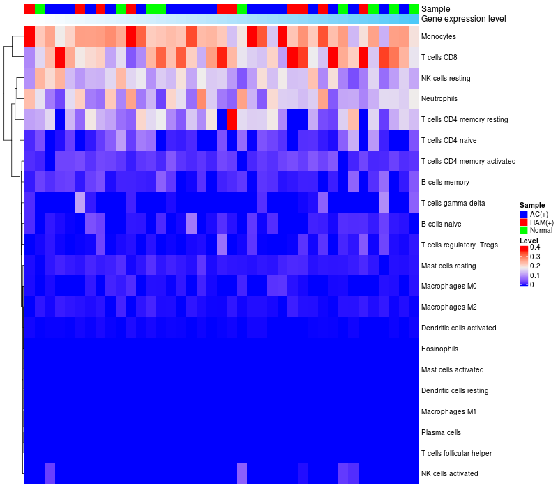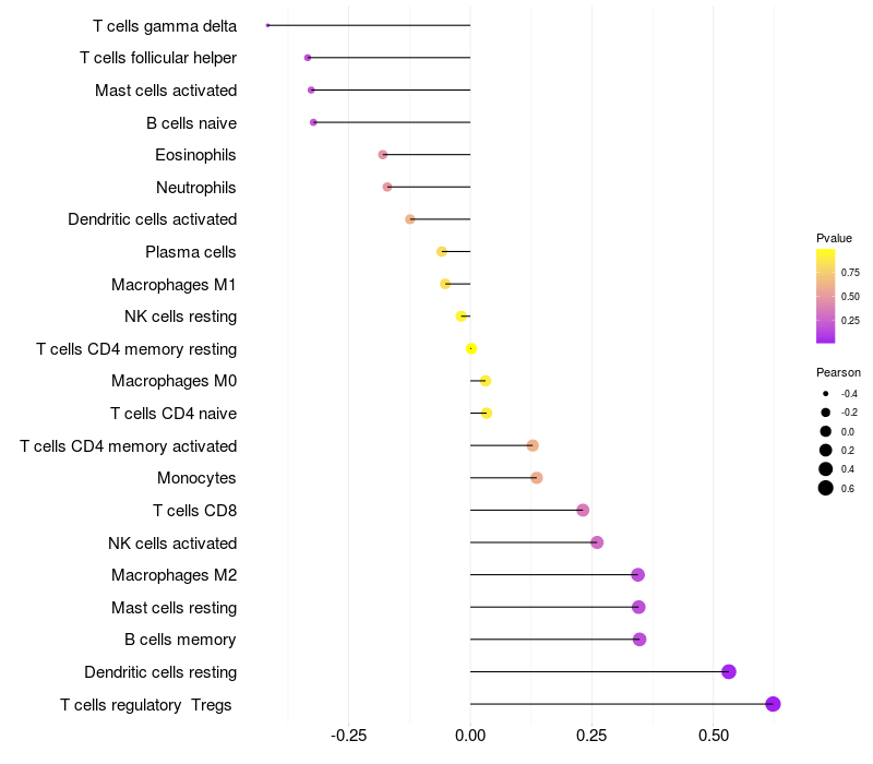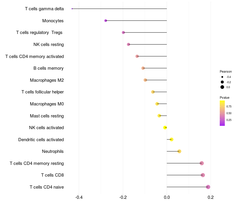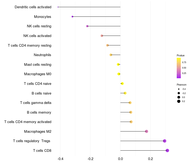 Lollipop of BRPF3 expression and immune infiltrating cell level correlation result in HTLV1+ samples
