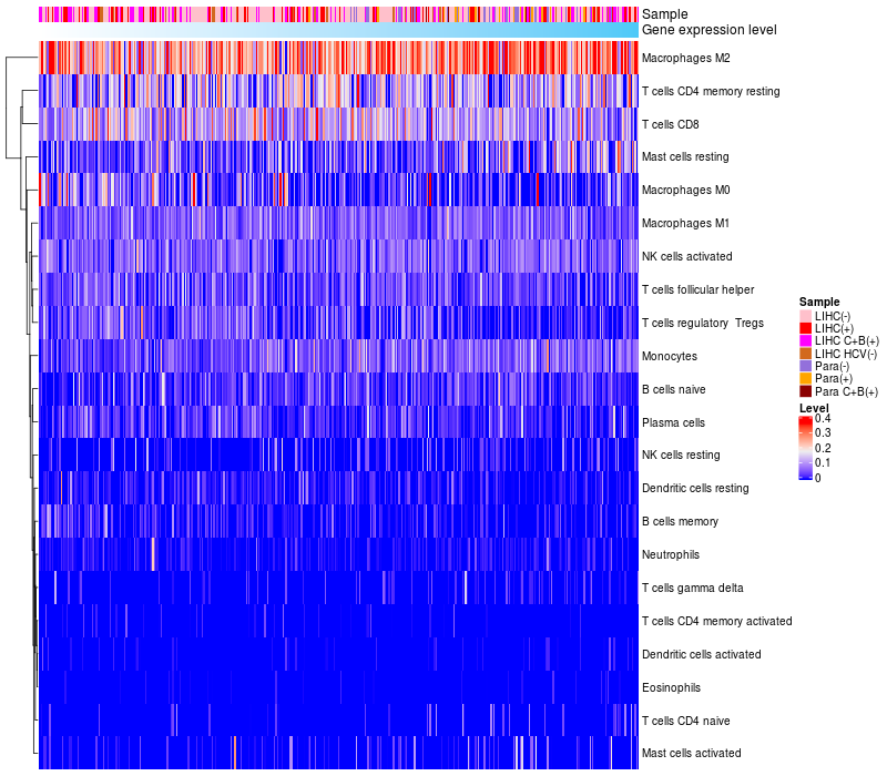 Liver hepatocellular carcinoma HCV (HBV+)(86), Liver hepatocellular carcinoma HCV (HBV-)(19), Liver hepatocellular carcinoma (HBV+)(209), Liver hepatocellular carcinoma (HBV+)(60), Paracancerous HCV (HBV+)(4), Paracancerous (HBV-)(28), Paracancerous (HBV+)(18) |