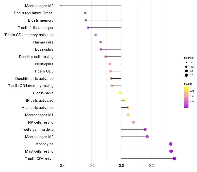 Lollipop of BTD expression and immune infiltrating cell level correlation result in HBV+ samples