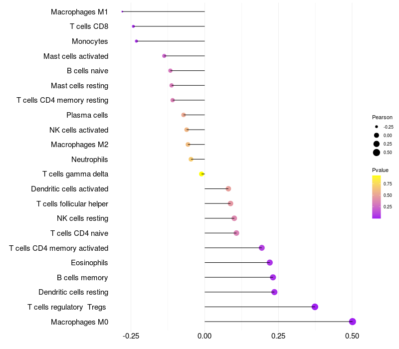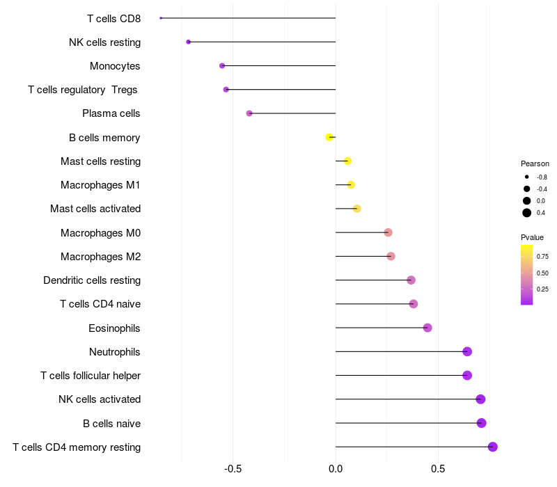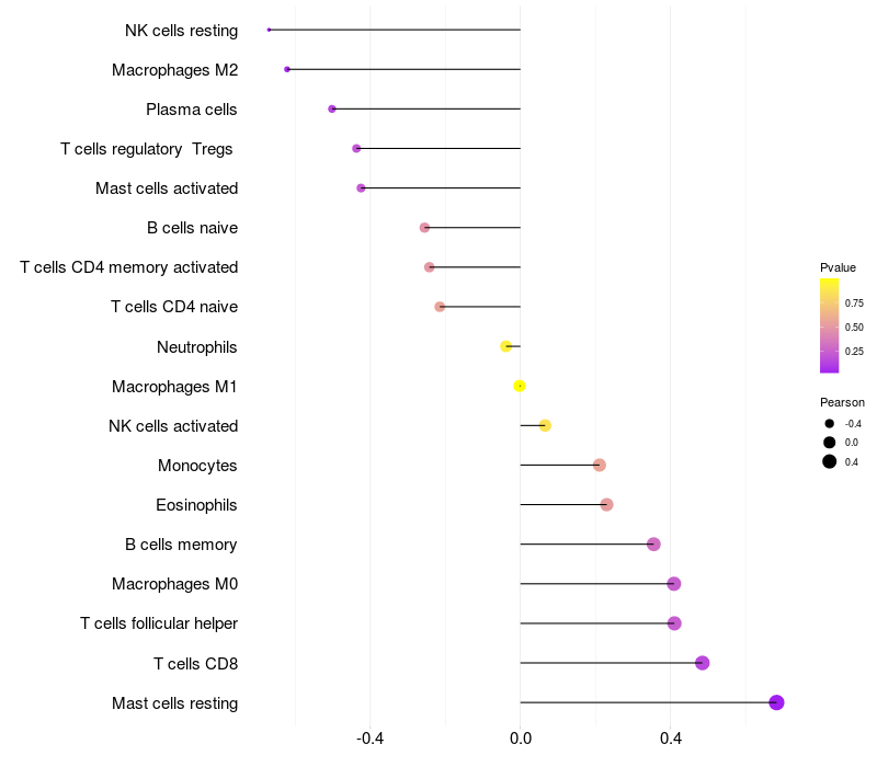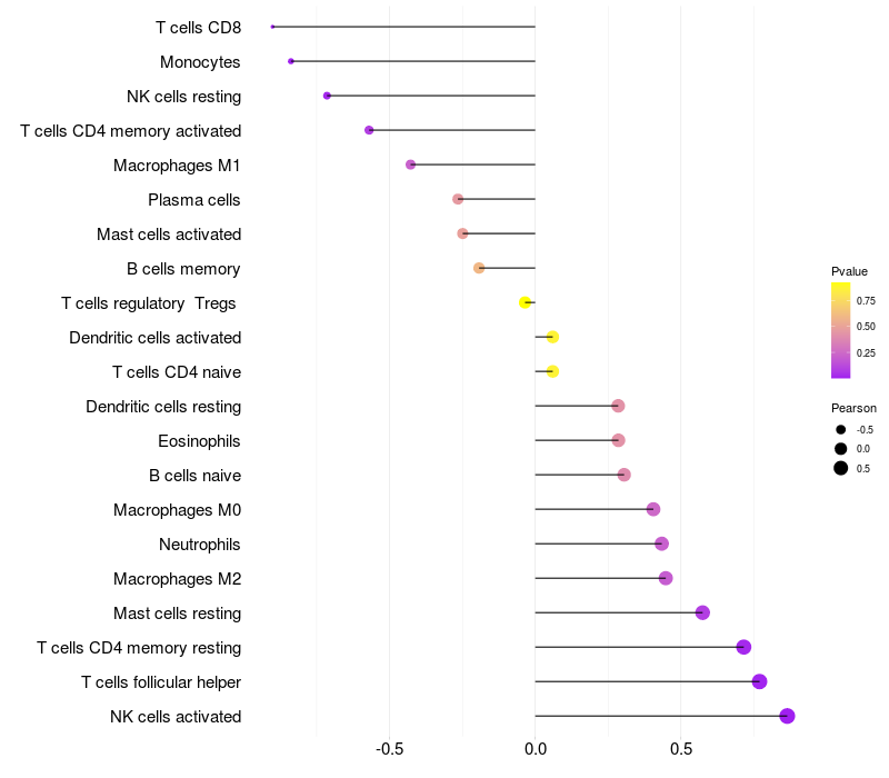 Lollipop of BZW2 expression and immune infiltrating cell level correlation result in HBV+ Liver cirrhosis samples