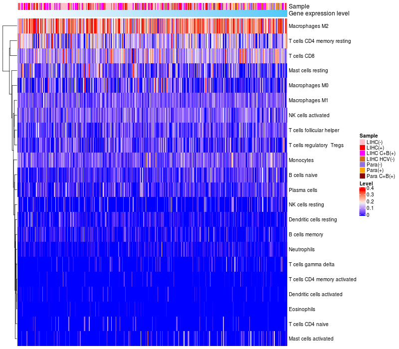 Liver hepatocellular carcinoma HCV (HBV+)(86), Liver hepatocellular carcinoma HCV (HBV-)(19), Liver hepatocellular carcinoma (HBV+)(209), Liver hepatocellular carcinoma (HBV+)(60), Paracancerous HCV (HBV+)(4), Paracancerous (HBV-)(28), Paracancerous (HBV+)(18) |
