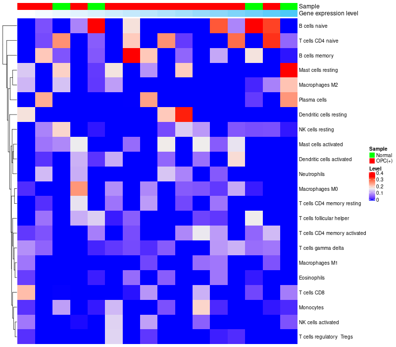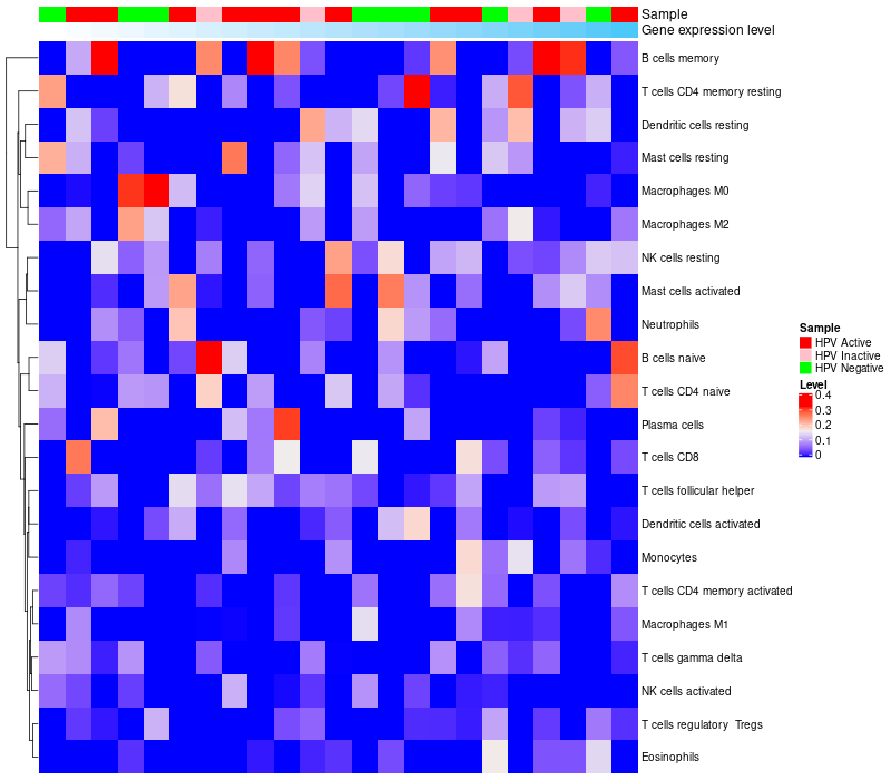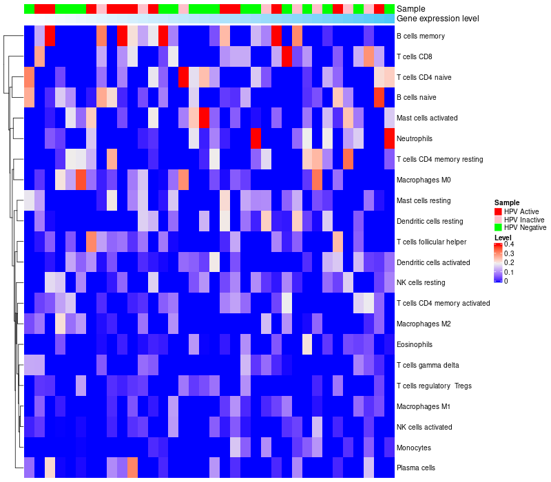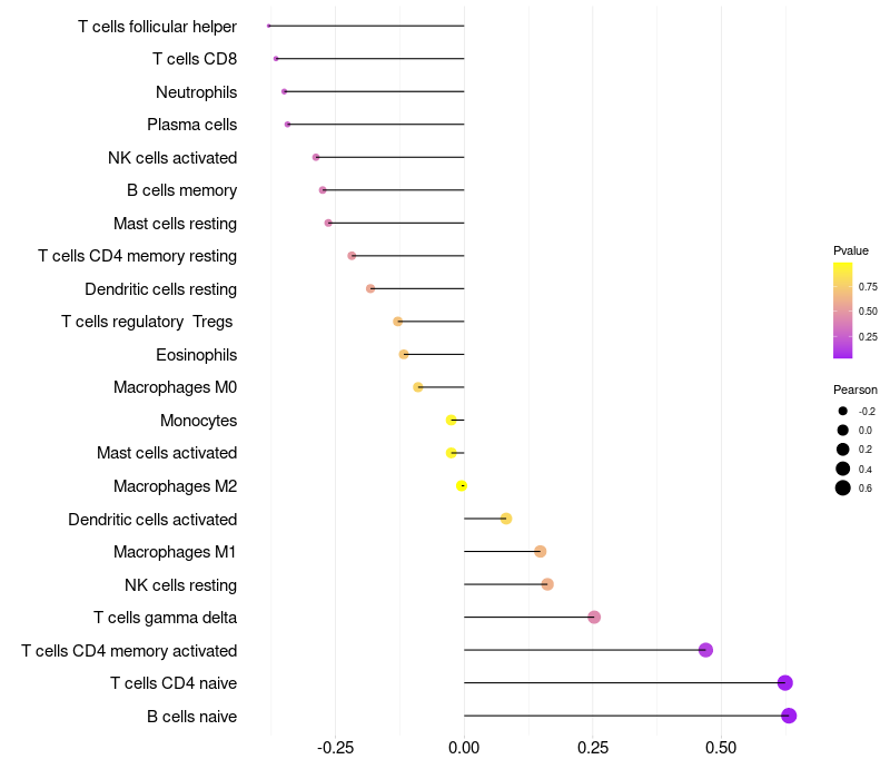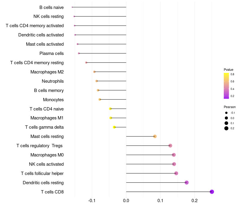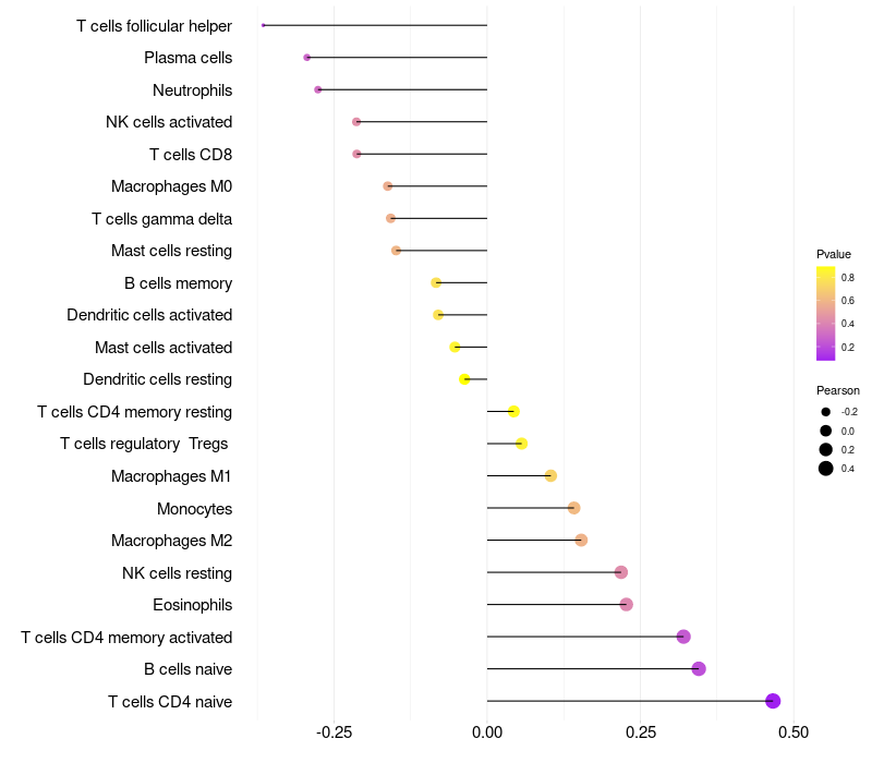 Lollipop of C16orf78 expression and immune infiltrating cell level correlation result in HPV+ samples
