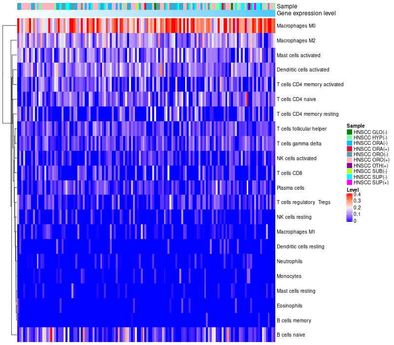 • Left: Heatmap of target gene expression and the level of various types of immune cells (cell type fractions) in all samples based on CIBERSORT method.