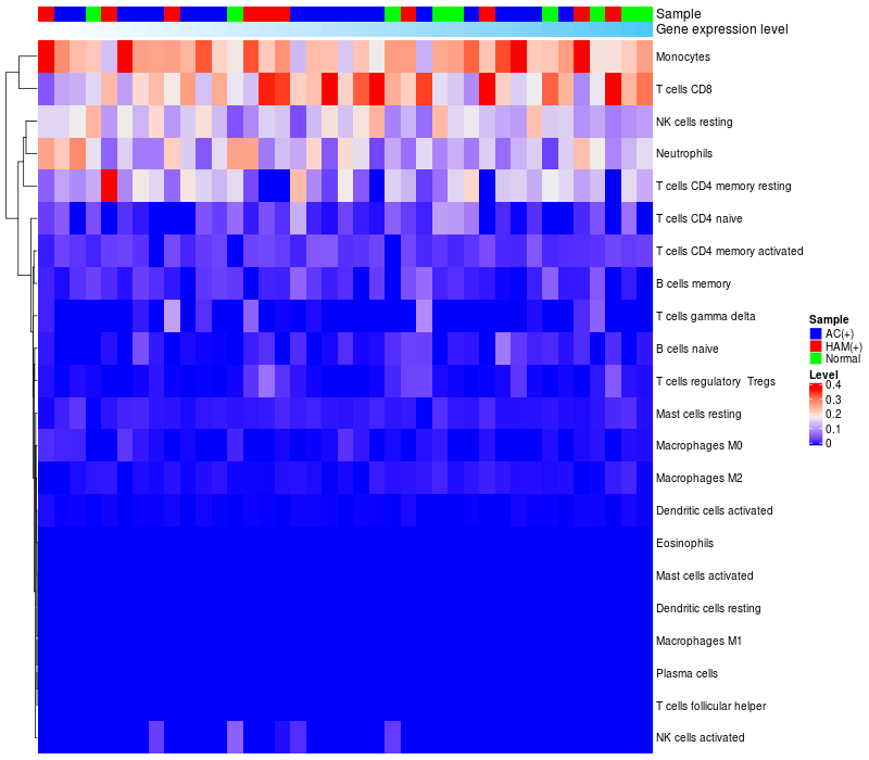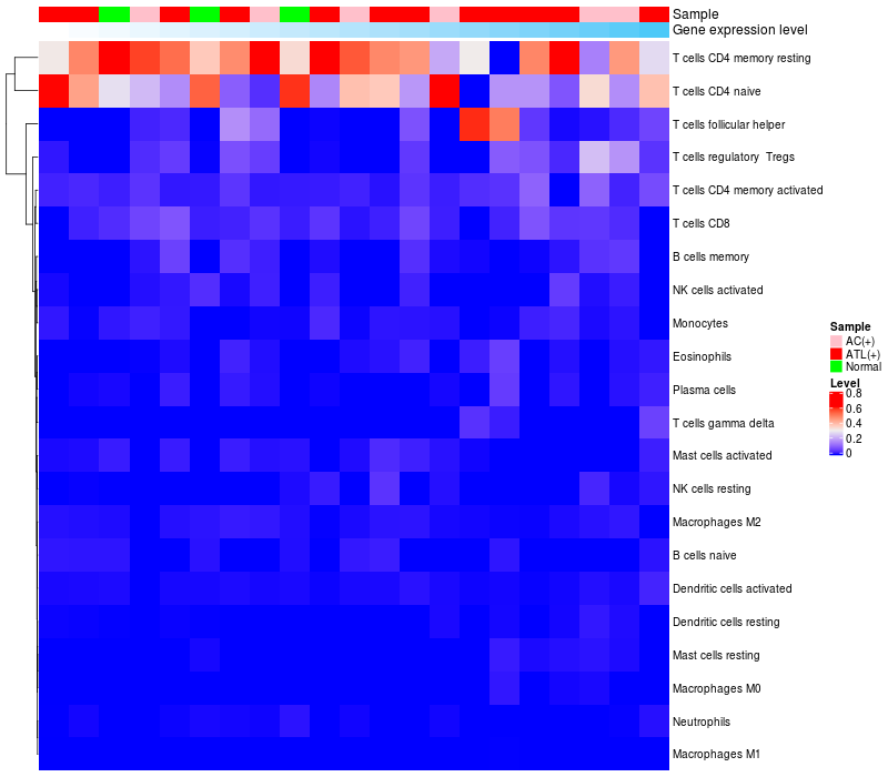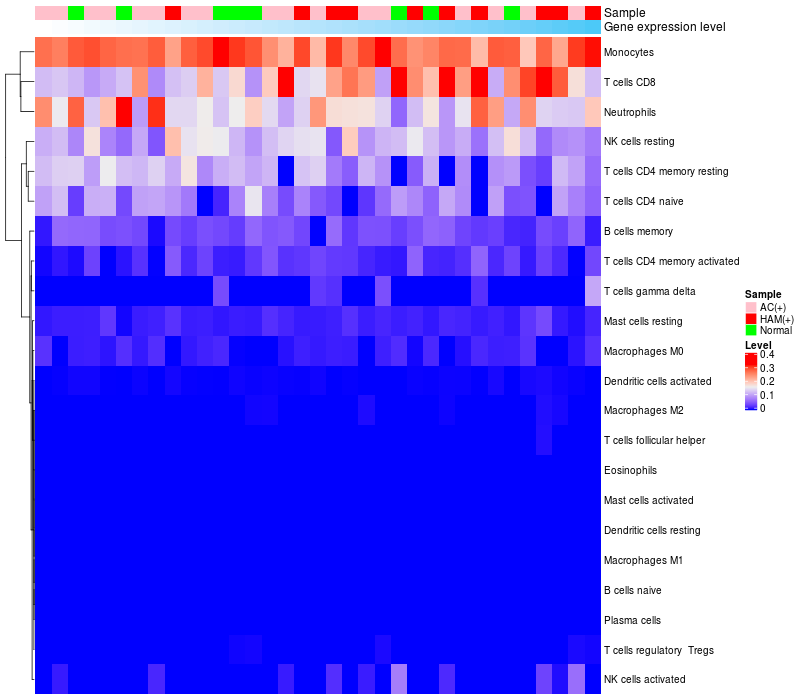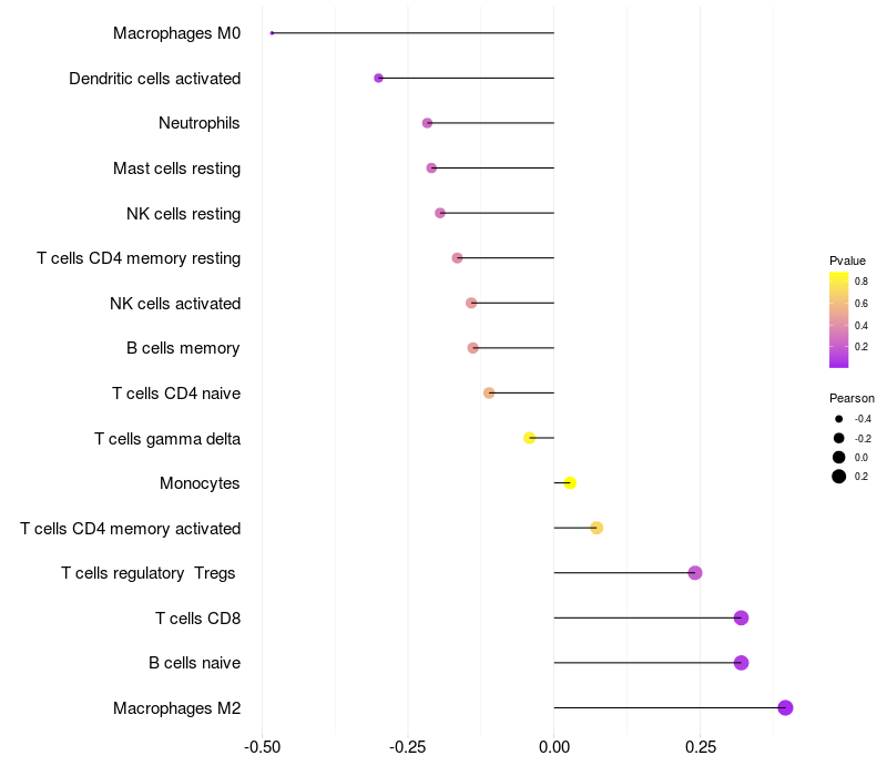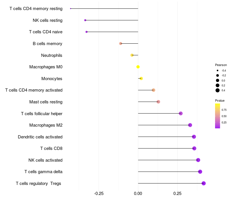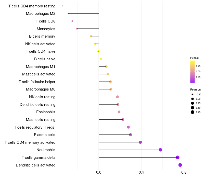 Lollipop of C18orf21 expression and immune infiltrating cell level correlation result in HTLV1+ samples