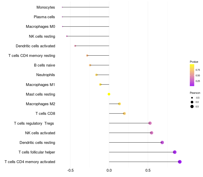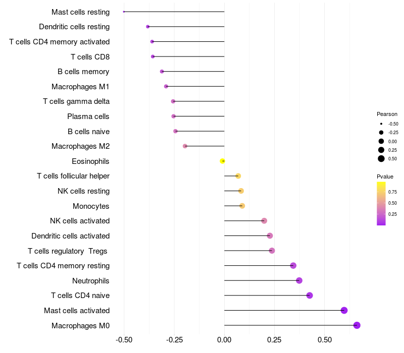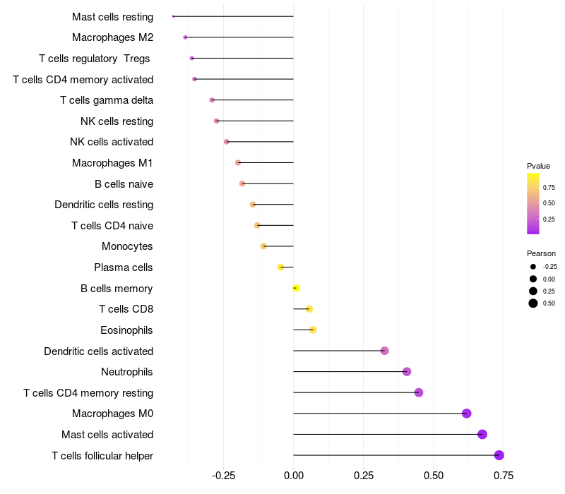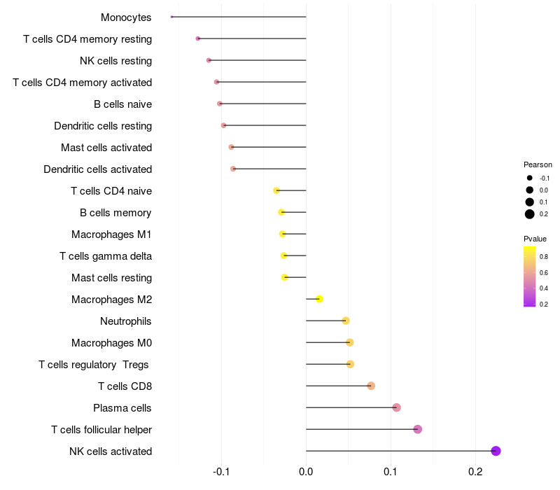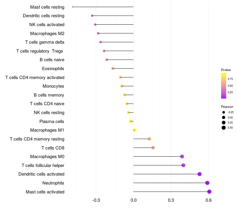 Lollipop of C1orf100 expression and immune infiltrating cell level correlation result in HPV+ samples