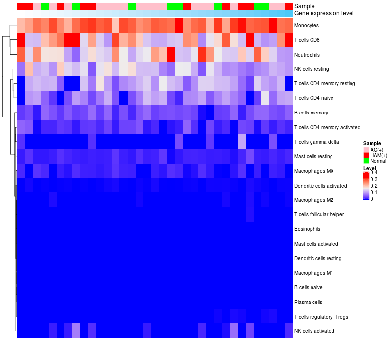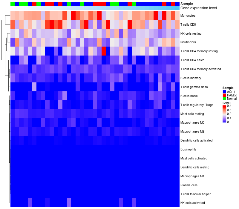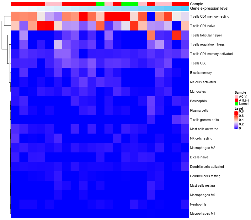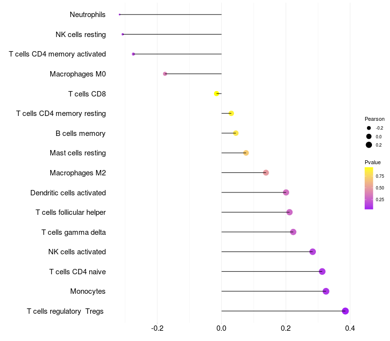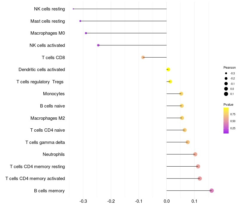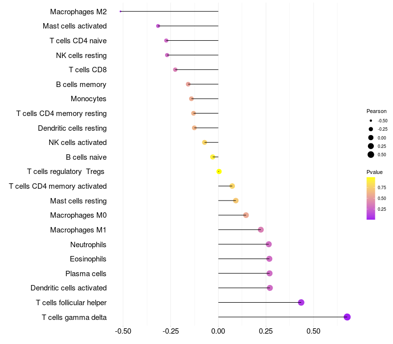 Lollipop of C1orf127 expression and immune infiltrating cell level correlation result in HTLV1+ samples