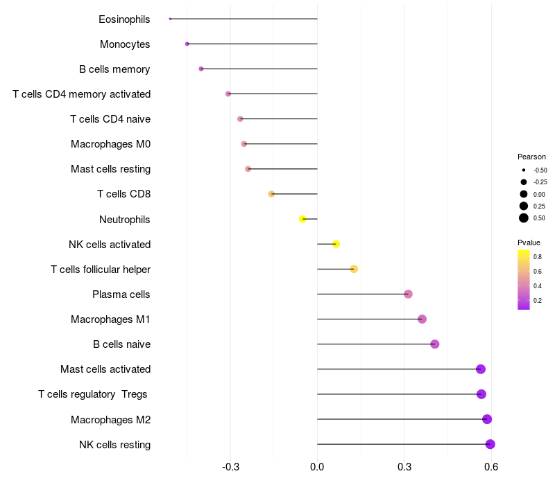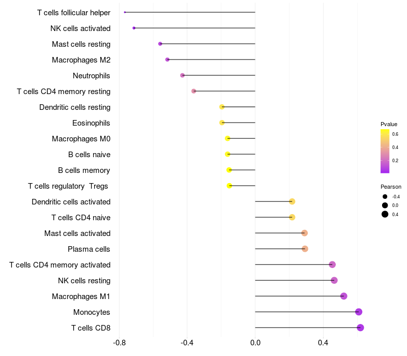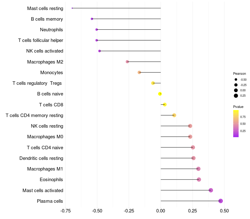 Lollipop of C1orf167 expression and immune infiltrating cell level correlation result in HBV+ Liver cirrhosis samples