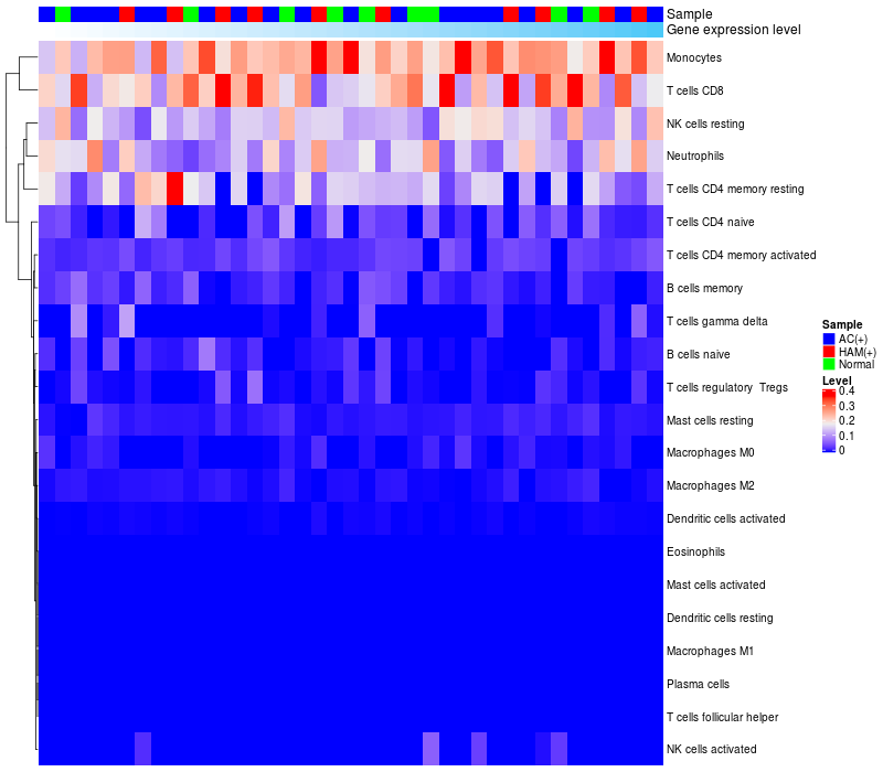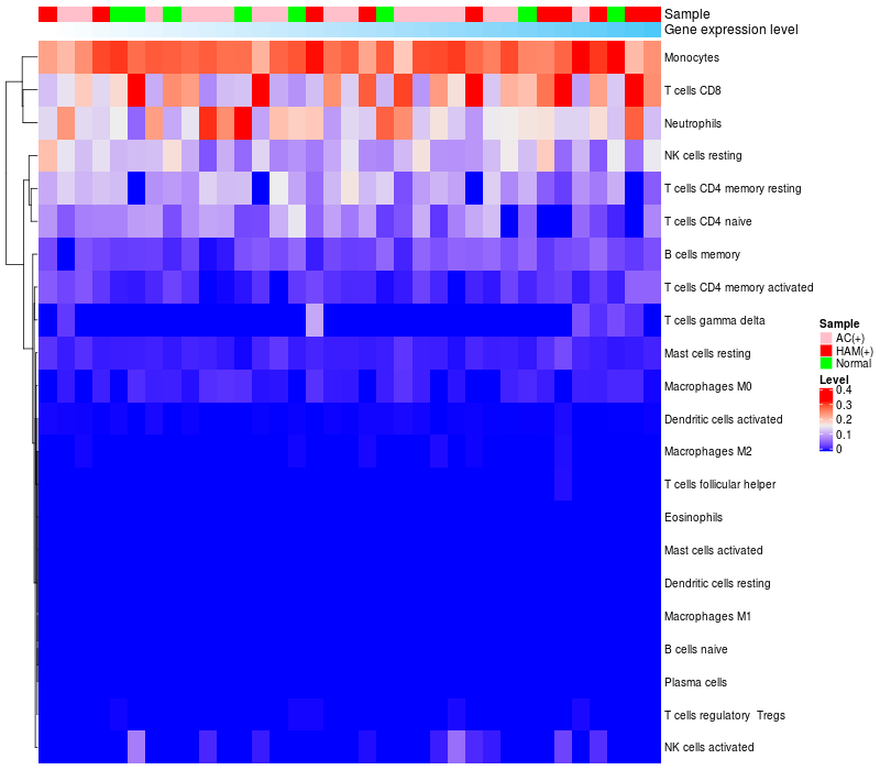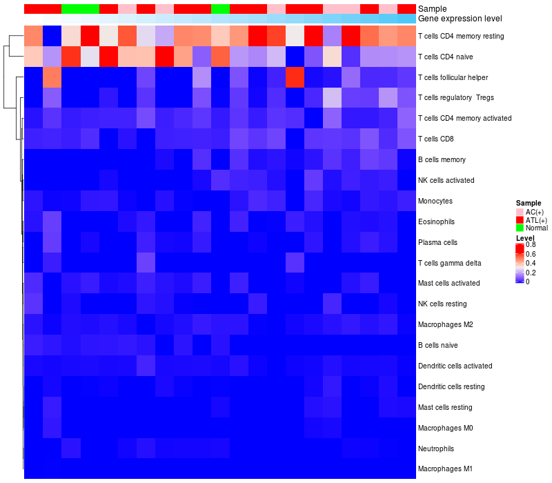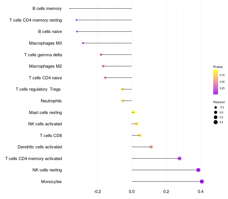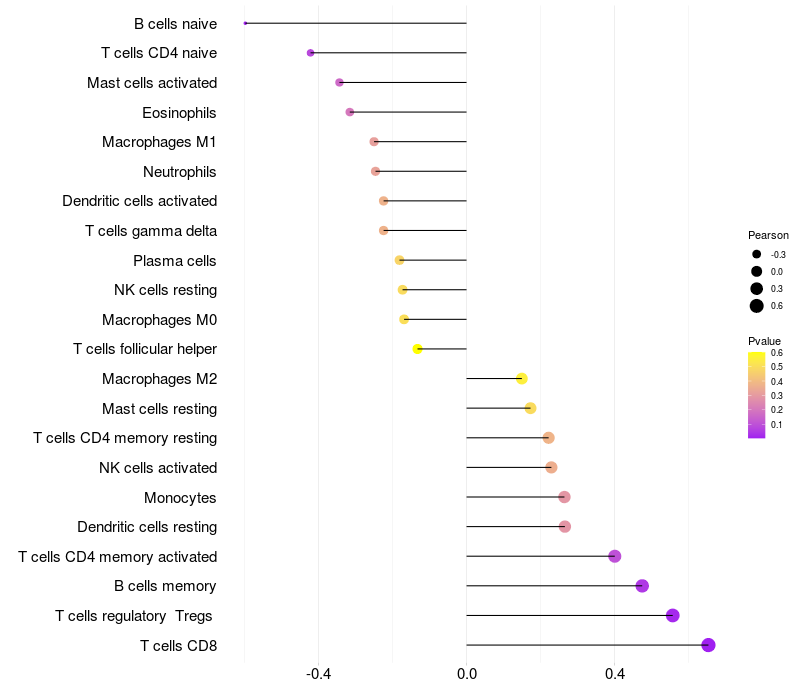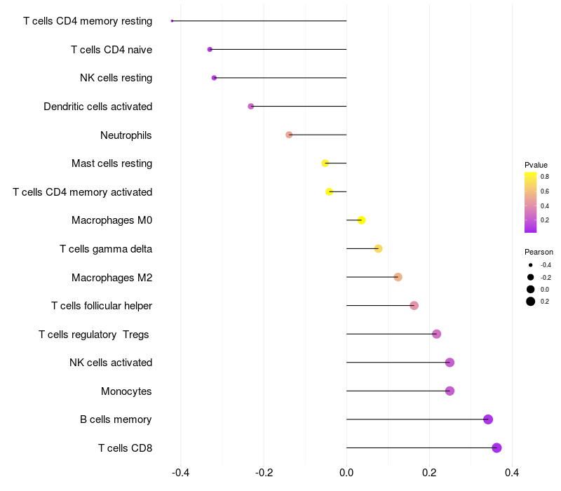 Lollipop of C20orf194 expression and immune infiltrating cell level correlation result in HTLV1+ samples