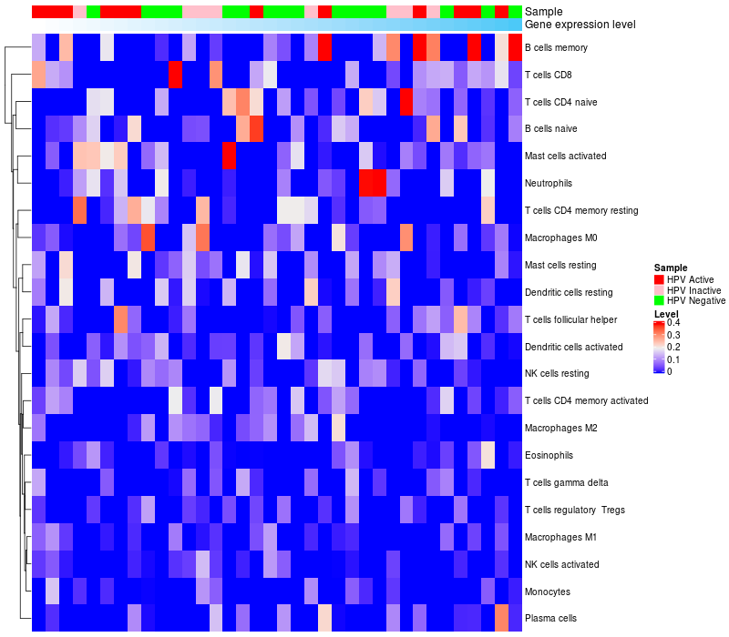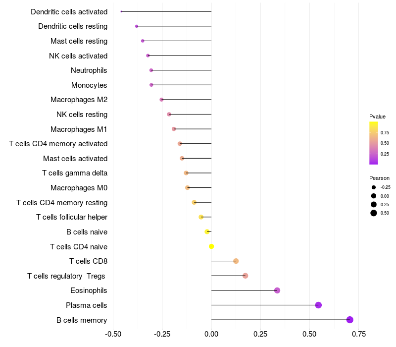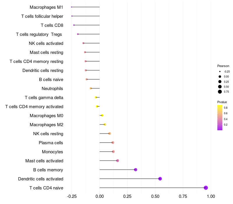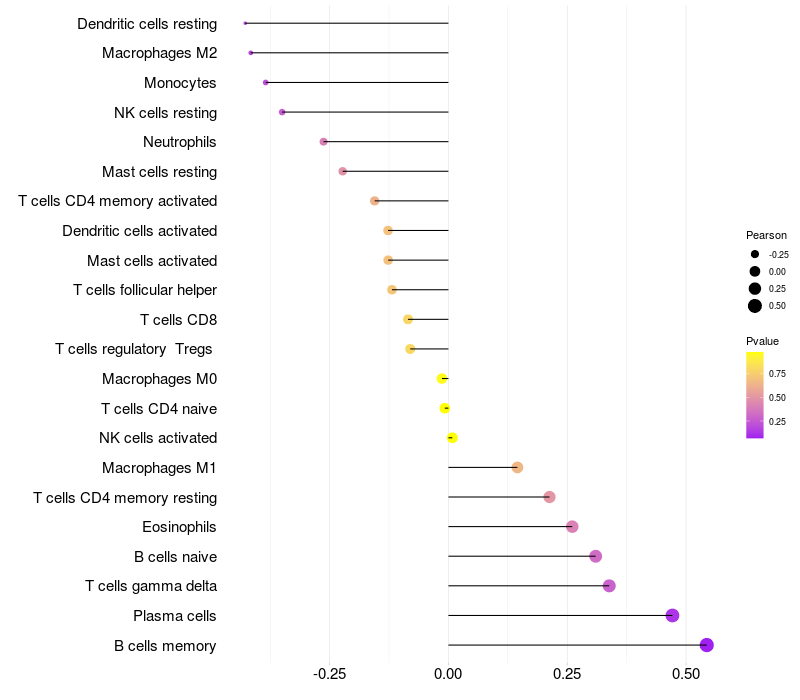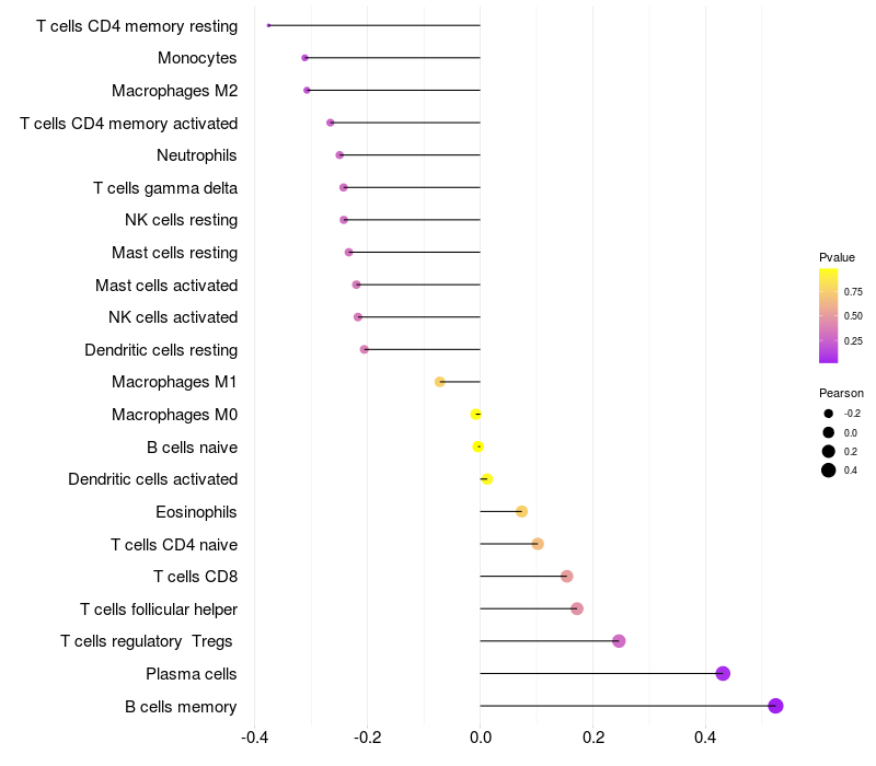 Lollipop of C21orf62 expression and immune infiltrating cell level correlation result in HPV+ samples