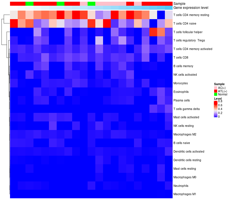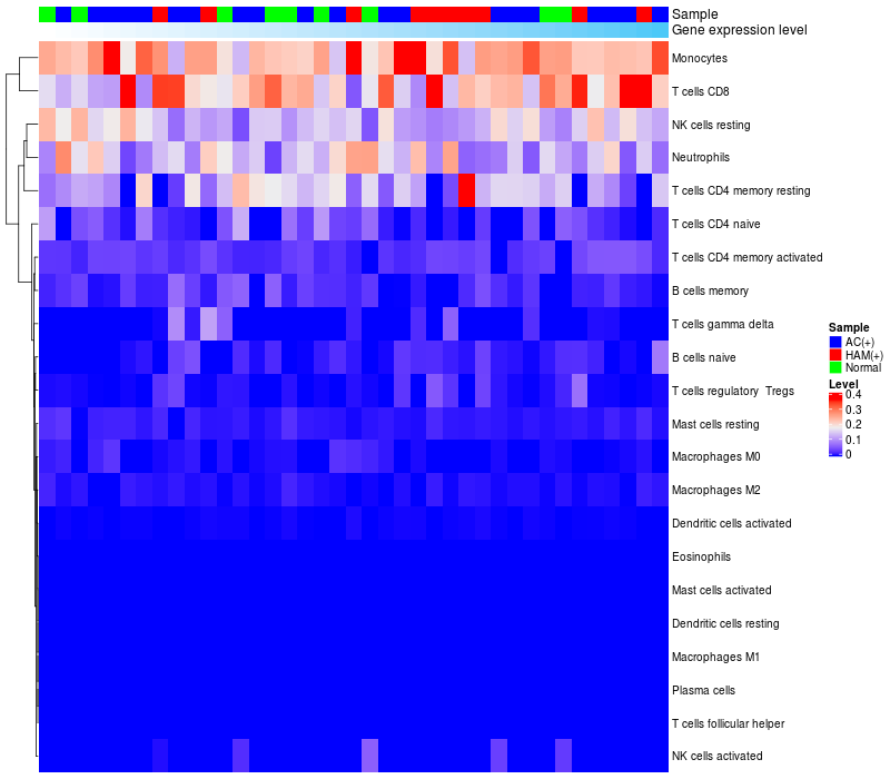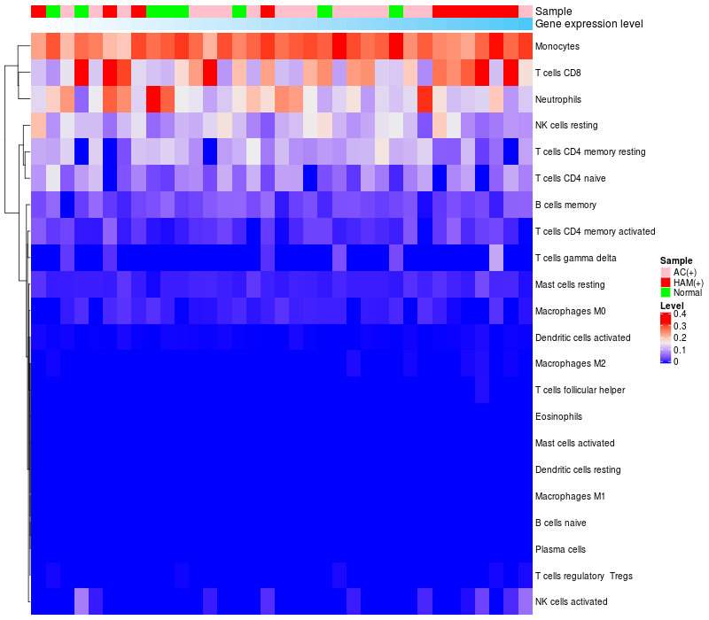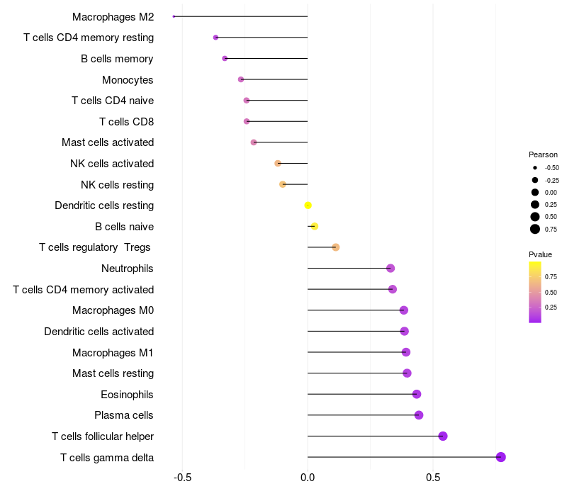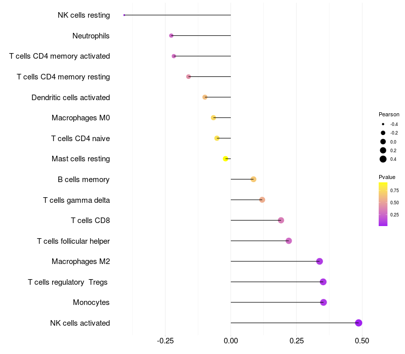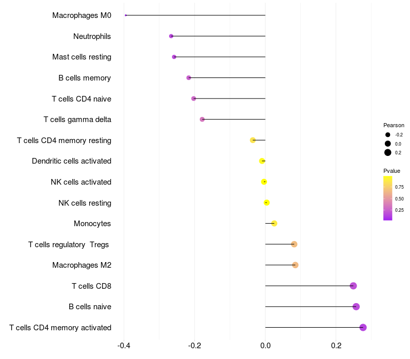 Lollipop of C5orf15 expression and immune infiltrating cell level correlation result in HTLV1+ samples