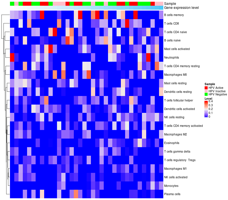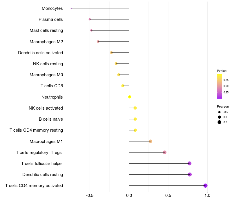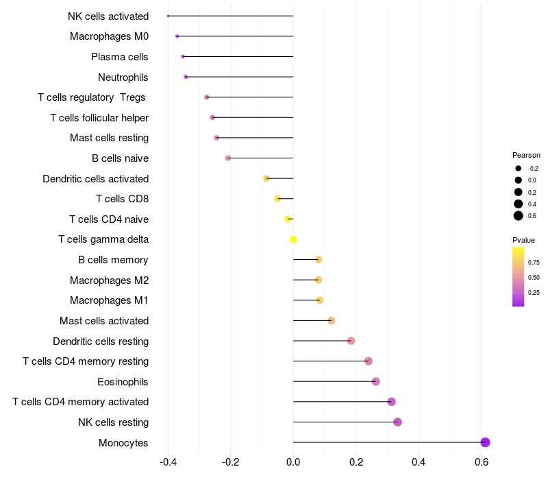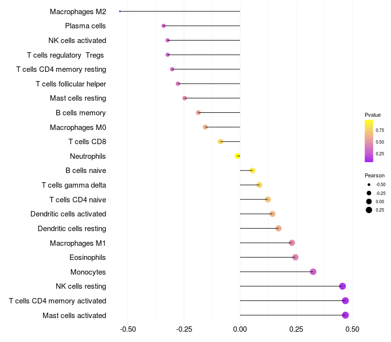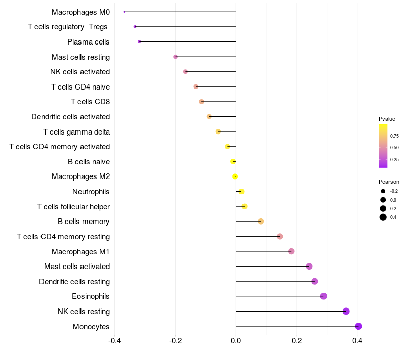 Lollipop of C5orf64 expression and immune infiltrating cell level correlation result in HPV+ samples