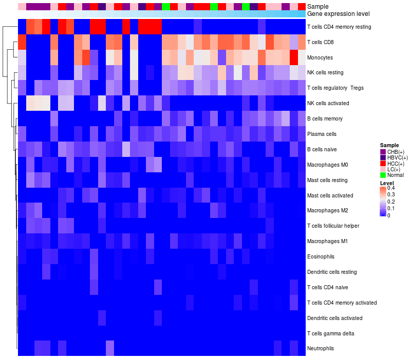Chronic hepatitis B patients (HBV+)(10),Hepatocellular carcinoma (HBV+)(10),Liver cirrhosis(HBV+)(10),Normal(3),HBV carriers (3) |