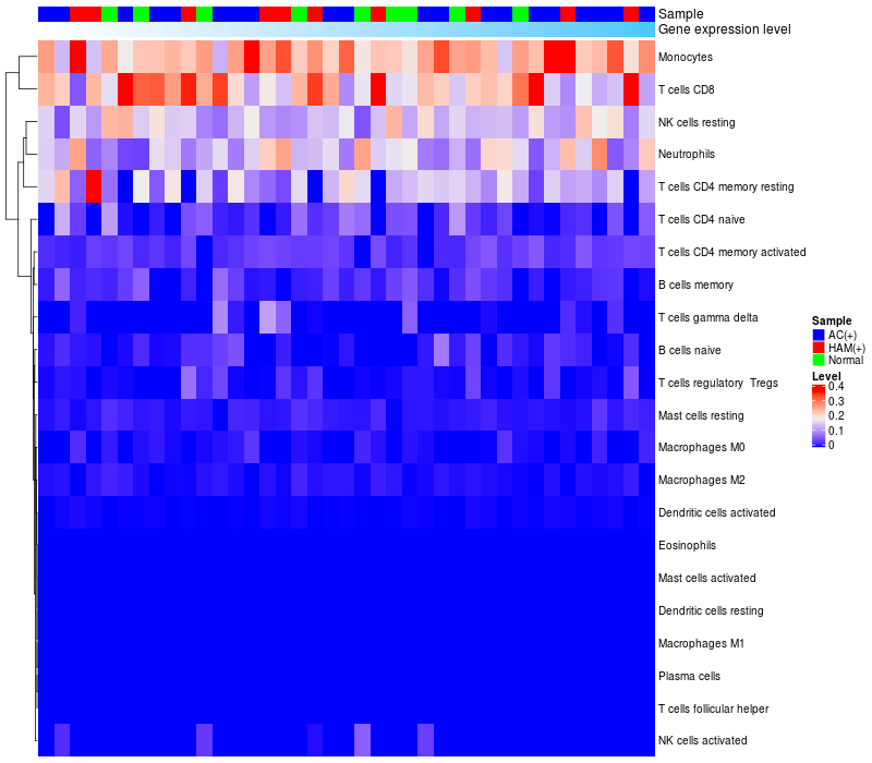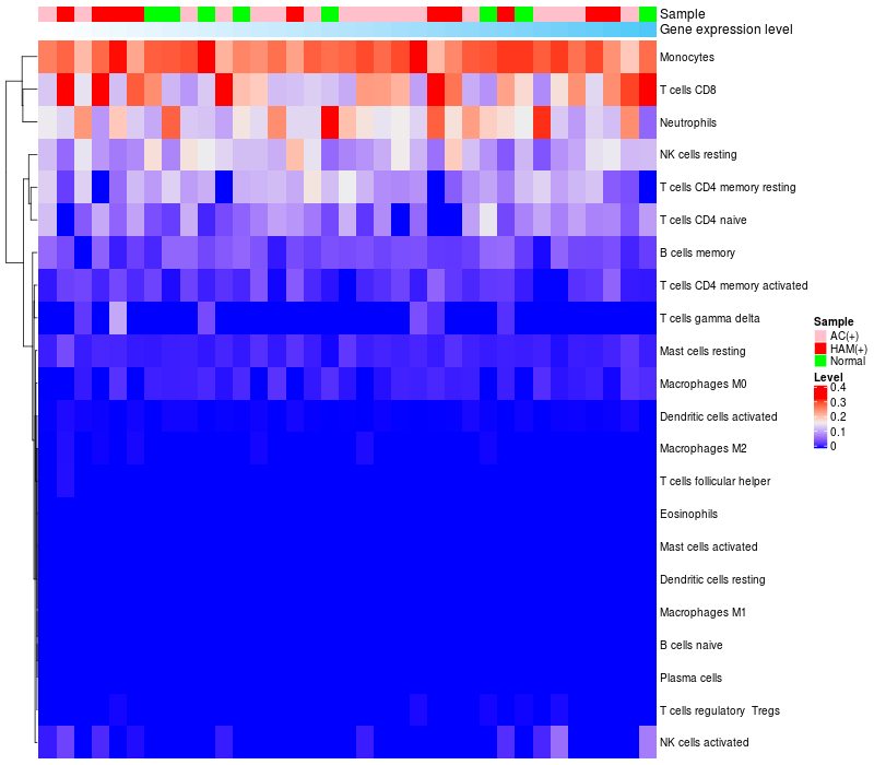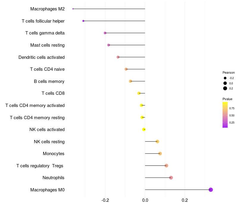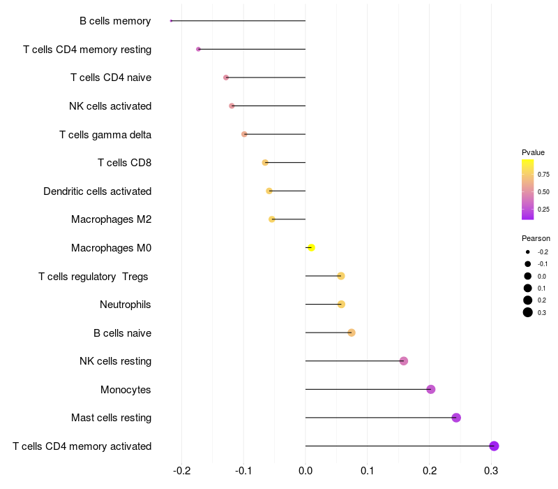 Lollipop of CA13 expression and immune infiltrating cell level correlation result in HTLV1+ samples