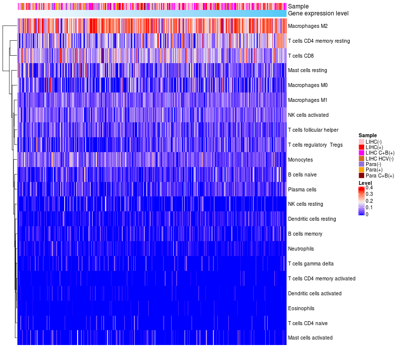 Liver hepatocellular carcinoma HCV (HBV+)(86), Liver hepatocellular carcinoma HCV (HBV-)(19), Liver hepatocellular carcinoma (HBV+)(209), Liver hepatocellular carcinoma (HBV+)(60), Paracancerous HCV (HBV+)(4), Paracancerous (HBV-)(28), Paracancerous (HBV+)(18) |
