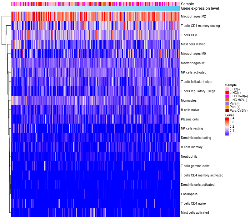 Liver hepatocellular carcinoma HCV (HBV+)(86), Liver hepatocellular carcinoma HCV (HBV-)(19), Liver hepatocellular carcinoma (HBV+)(209), Liver hepatocellular carcinoma (HBV+)(60), Paracancerous HCV (HBV+)(4), Paracancerous (HBV-)(28), Paracancerous (HBV+)(18) |