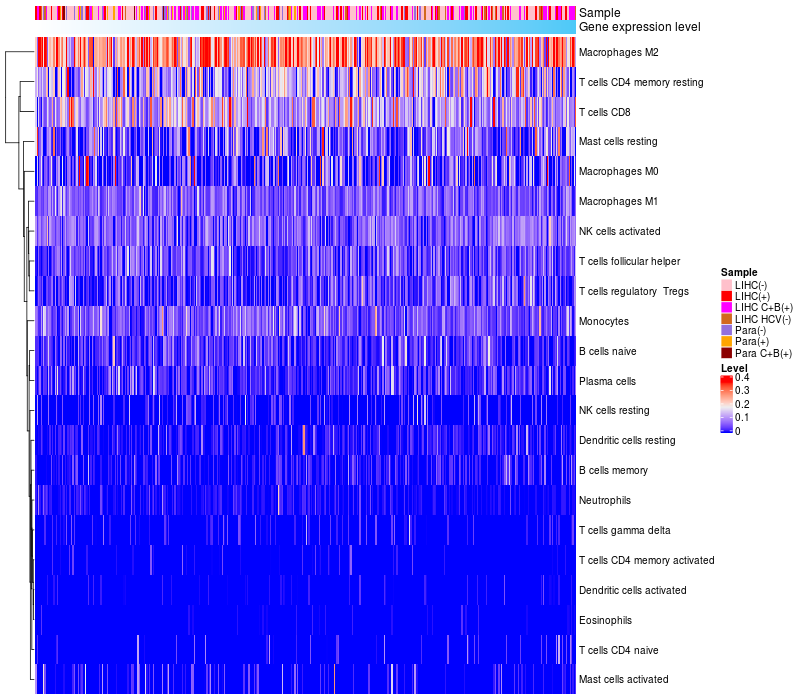 Liver hepatocellular carcinoma HCV (HBV+)(86), Liver hepatocellular carcinoma HCV (HBV-)(19), Liver hepatocellular carcinoma (HBV+)(209), Liver hepatocellular carcinoma (HBV+)(60), Paracancerous HCV (HBV+)(4), Paracancerous (HBV-)(28), Paracancerous (HBV+)(18) |