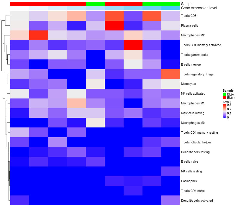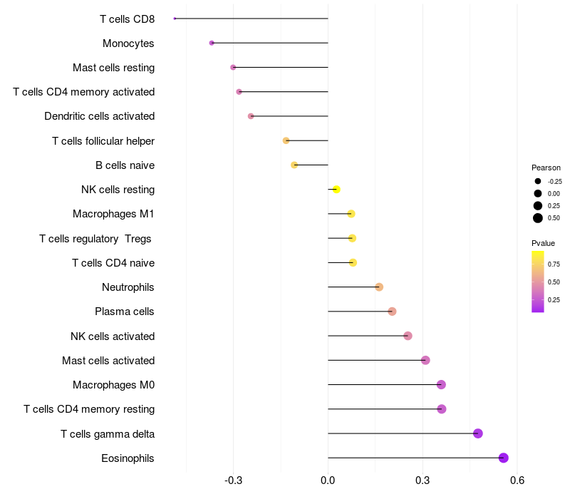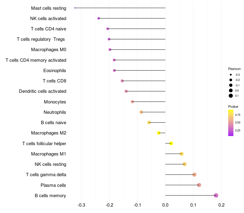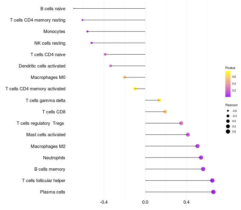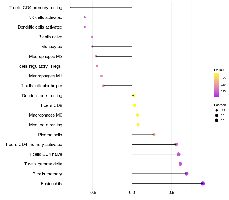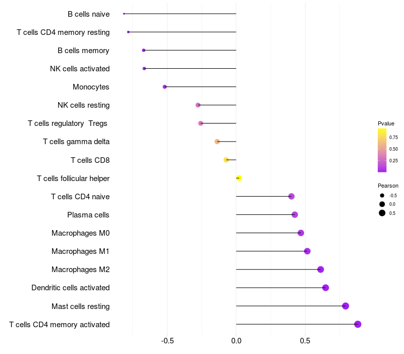 Lollipop of CACNB4 expression and immune infiltrating cell level correlation result in EBV+ samples