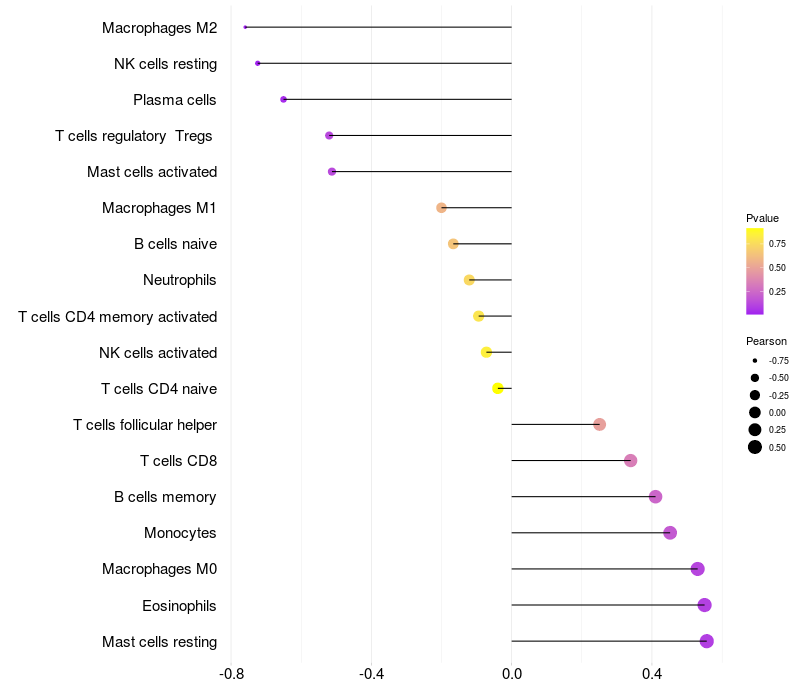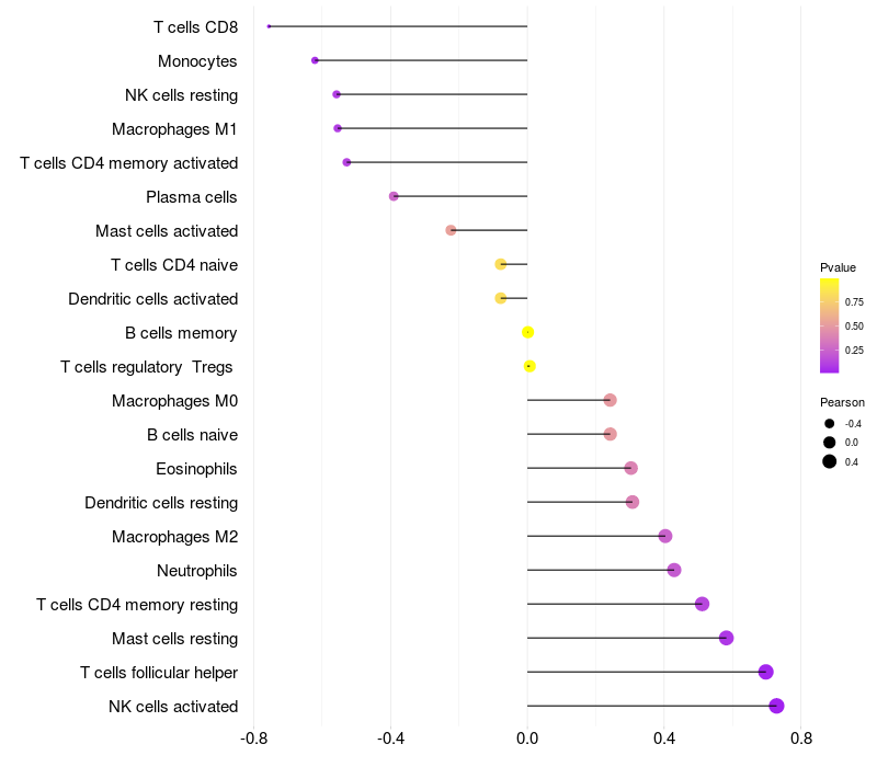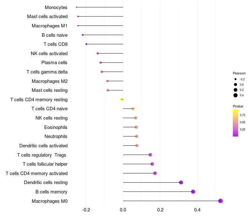 Lollipop of CACYBP expression and immune infiltrating cell level correlation result in HBV+ Chronic HBV (CHB) infection samples