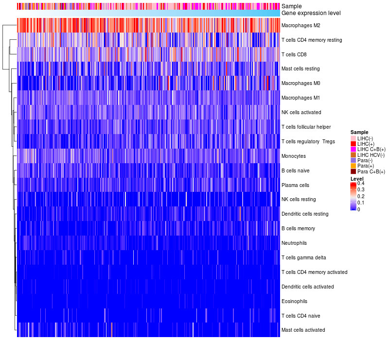 Liver hepatocellular carcinoma HCV (HBV+)(86), Liver hepatocellular carcinoma HCV (HBV-)(19), Liver hepatocellular carcinoma (HBV+)(209), Liver hepatocellular carcinoma (HBV+)(60), Paracancerous HCV (HBV+)(4), Paracancerous (HBV-)(28), Paracancerous (HBV+)(18) |