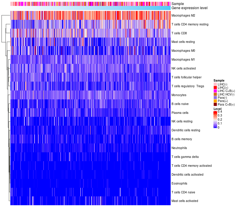 Liver hepatocellular carcinoma HCV (HBV+)(86), Liver hepatocellular carcinoma HCV (HBV-)(19), Liver hepatocellular carcinoma (HBV+)(209), Liver hepatocellular carcinoma (HBV+)(60), Paracancerous HCV (HBV+)(4), Paracancerous (HBV-)(28), Paracancerous (HBV+)(18) |
