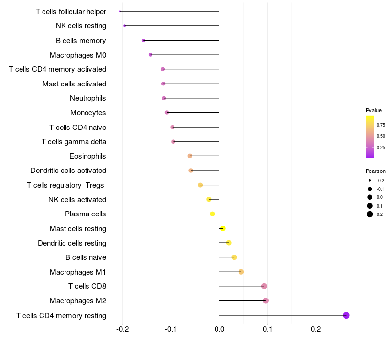 Lollipop of CALCRL expression and immune infiltrating cell level correlation result in HBV+ samples