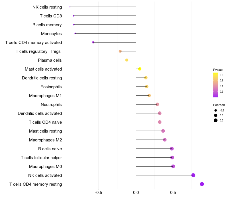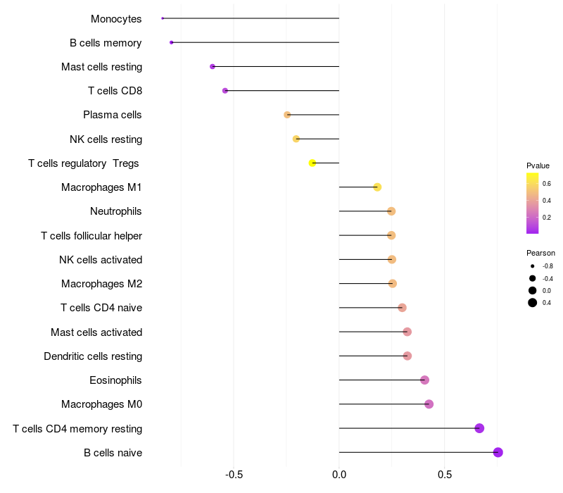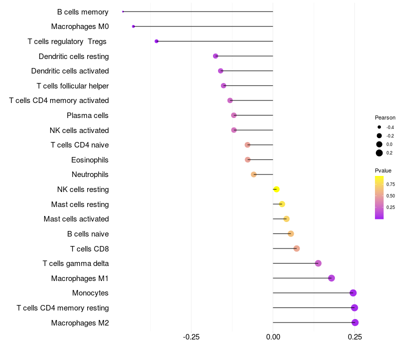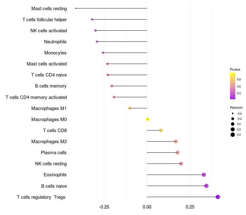 Lollipop of CALD1 expression and immune infiltrating cell level correlation result in HBV+ Liver cirrhosis samples