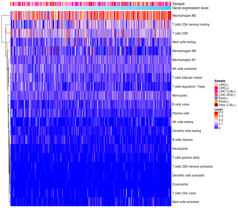 Liver hepatocellular carcinoma HCV (HBV+)(86), Liver hepatocellular carcinoma HCV (HBV-)(19), Liver hepatocellular carcinoma (HBV+)(209), Liver hepatocellular carcinoma (HBV+)(60), Paracancerous HCV (HBV+)(4), Paracancerous (HBV-)(28), Paracancerous (HBV+)(18) |