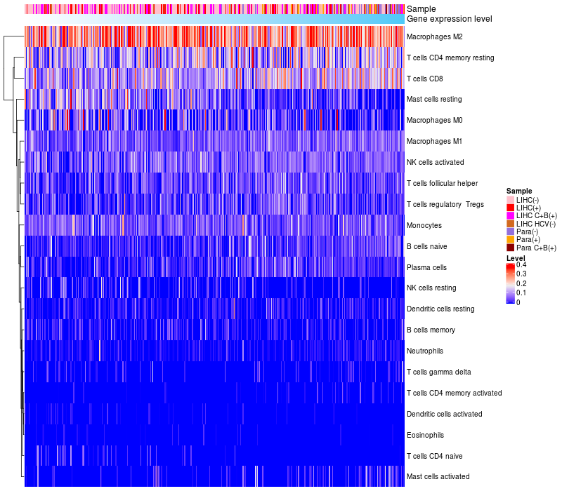 Liver hepatocellular carcinoma HCV (HBV+)(86), Liver hepatocellular carcinoma HCV (HBV-)(19), Liver hepatocellular carcinoma (HBV+)(209), Liver hepatocellular carcinoma (HBV+)(60), Paracancerous HCV (HBV+)(4), Paracancerous (HBV-)(28), Paracancerous (HBV+)(18) |