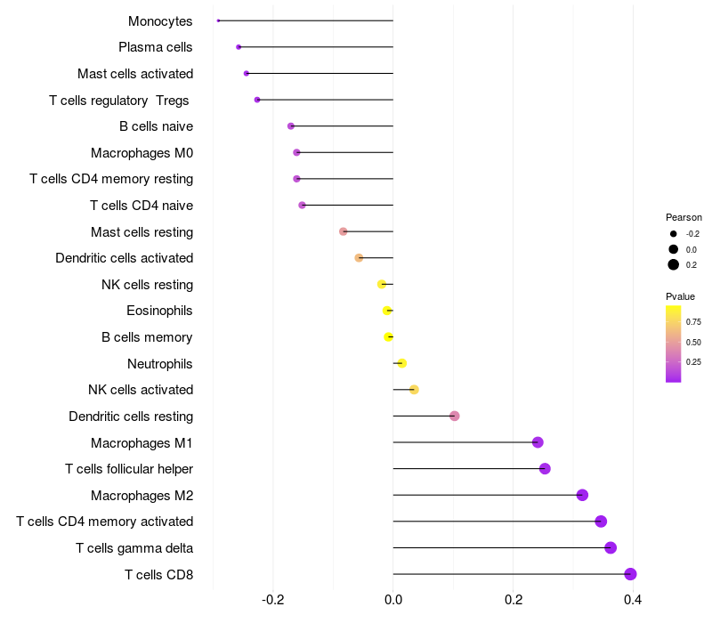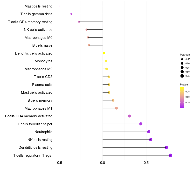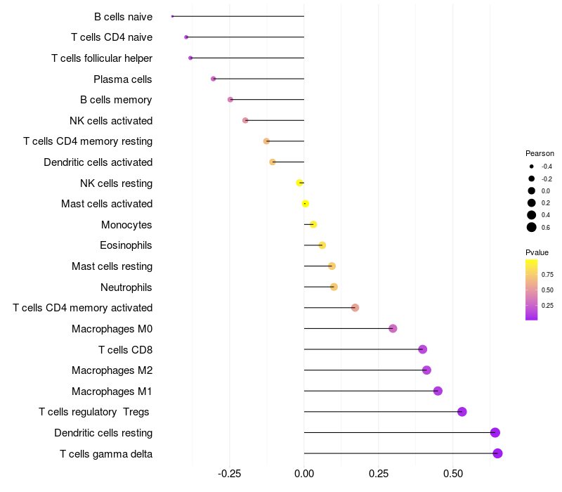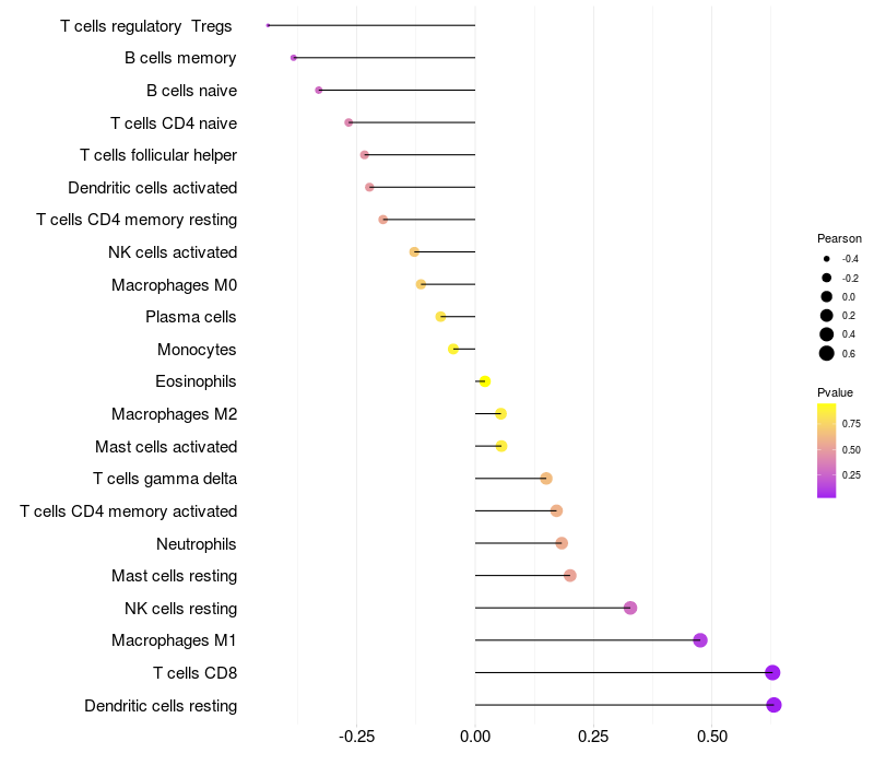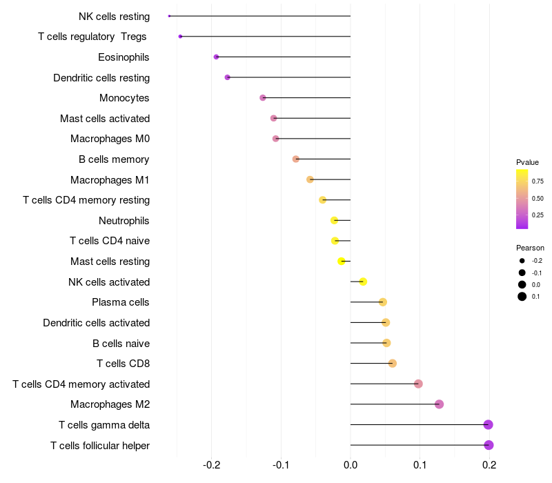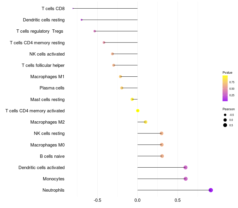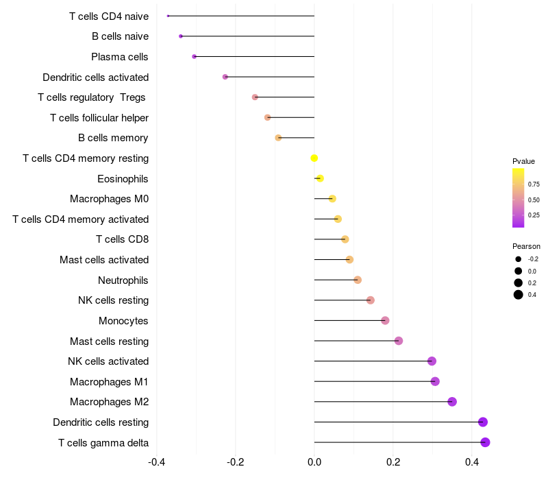 Lollipop of CAPG expression and immune infiltrating cell level correlation result in HPV+ samples