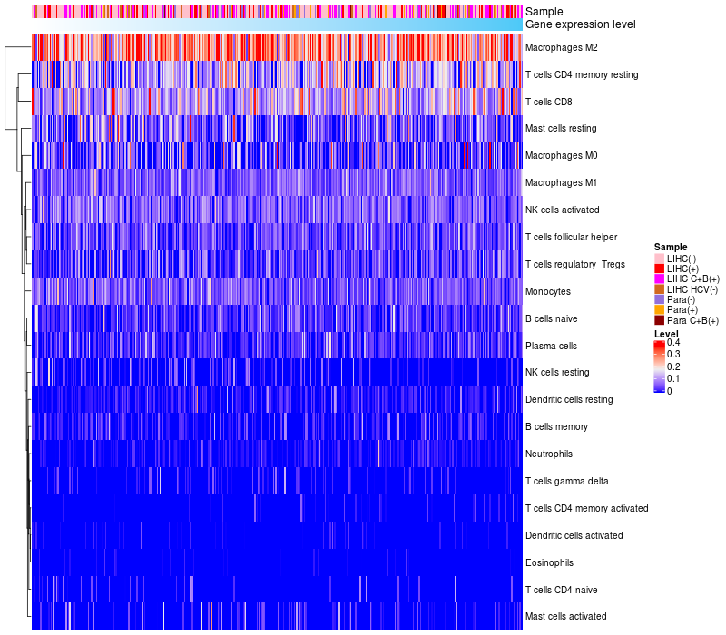Liver hepatocellular carcinoma HCV (HBV+)(86), Liver hepatocellular carcinoma HCV (HBV-)(19), Liver hepatocellular carcinoma (HBV+)(209), Liver hepatocellular carcinoma (HBV+)(60), Paracancerous HCV (HBV+)(4), Paracancerous (HBV-)(28), Paracancerous (HBV+)(18) |