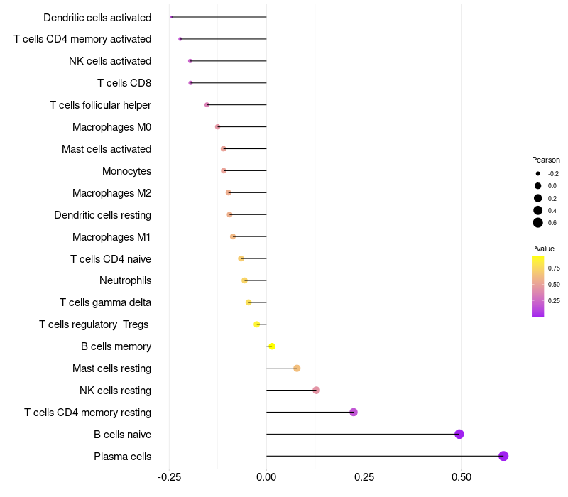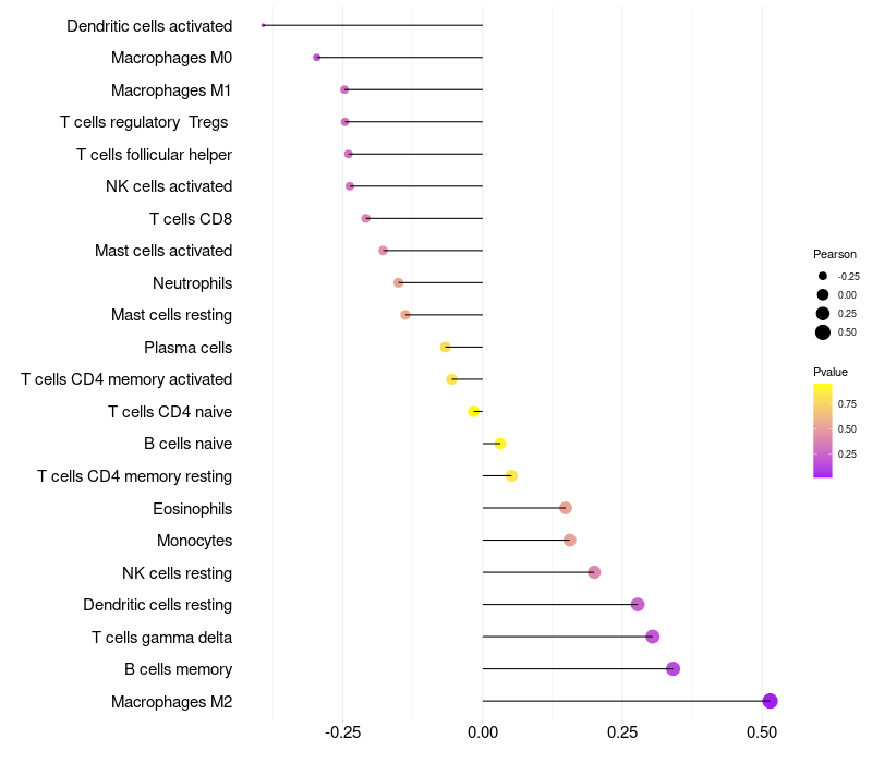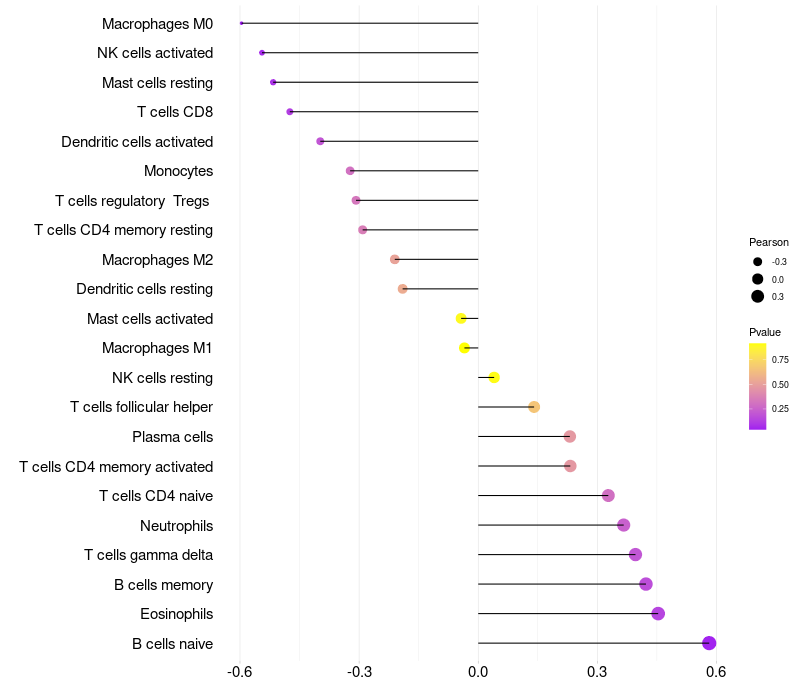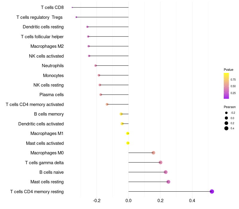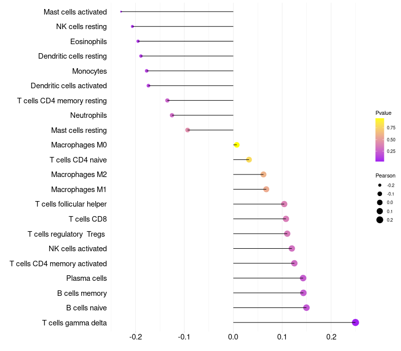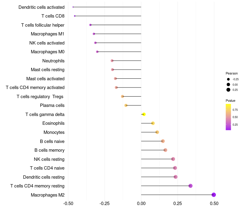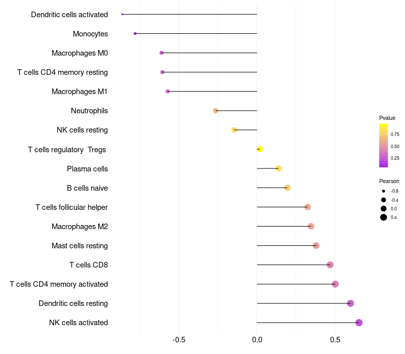 Lollipop of CBLN1 expression and immune infiltrating cell level correlation result in HPV+ samples