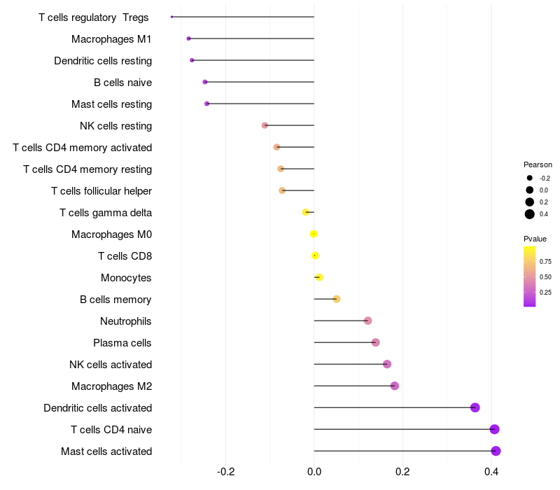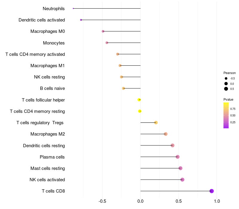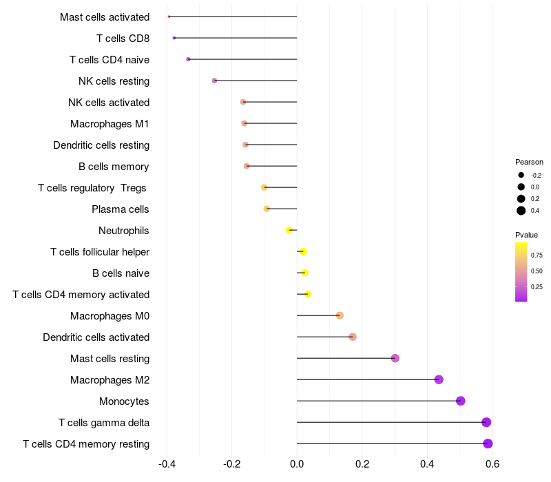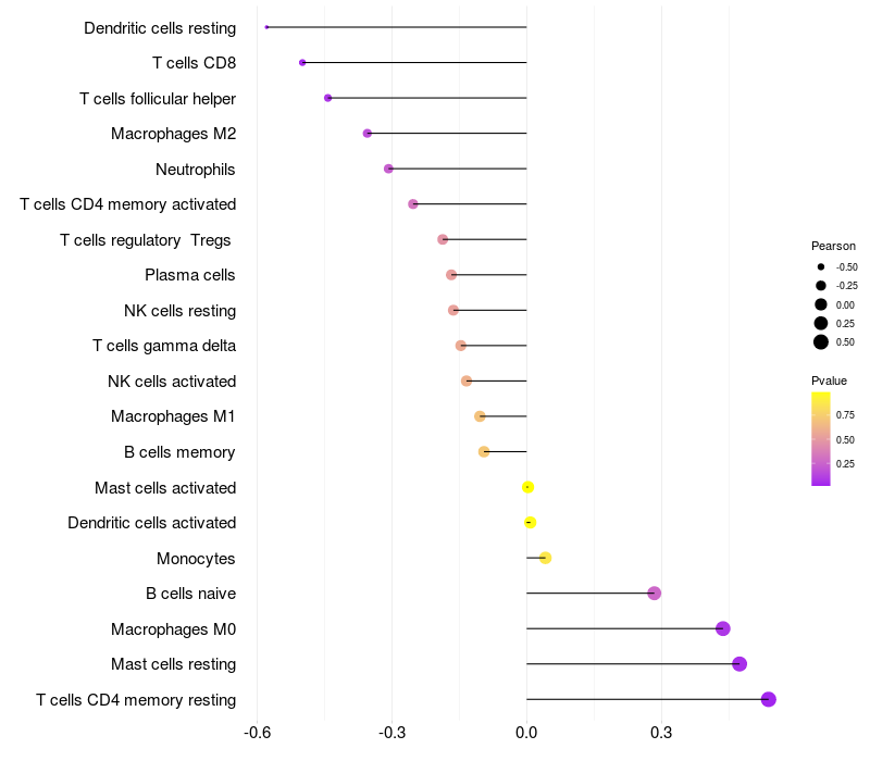 Lollipop of CBWD2 expression and immune infiltrating cell level correlation result in HPV+ samples