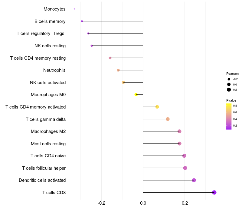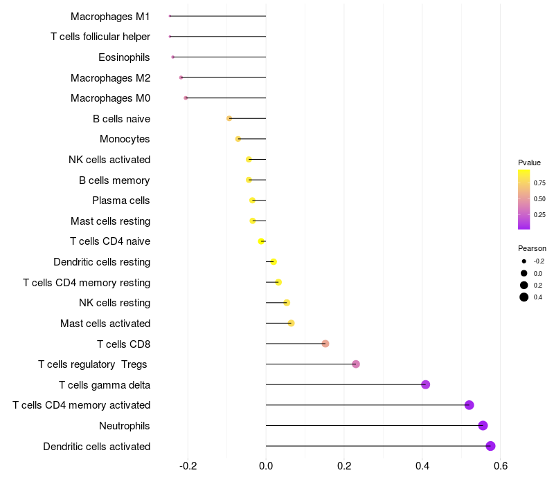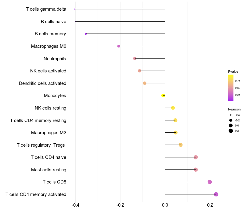 Lollipop of CCDC14 expression and immune infiltrating cell level correlation result in HTLV1+ samples