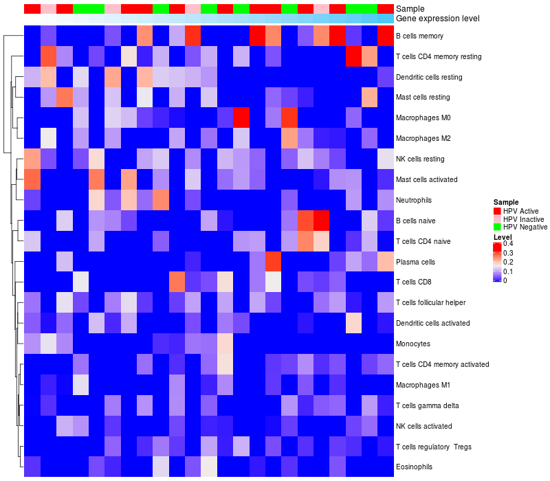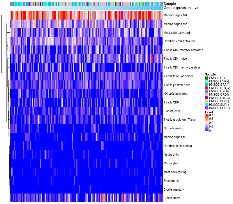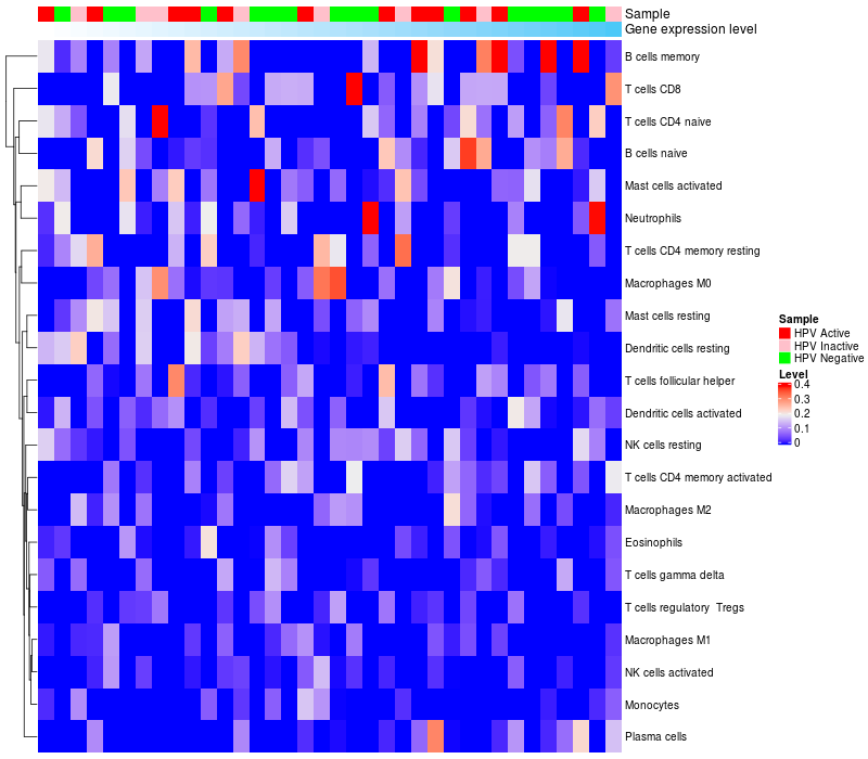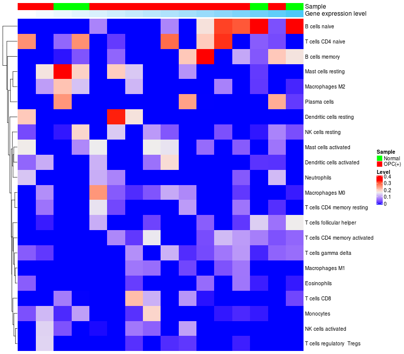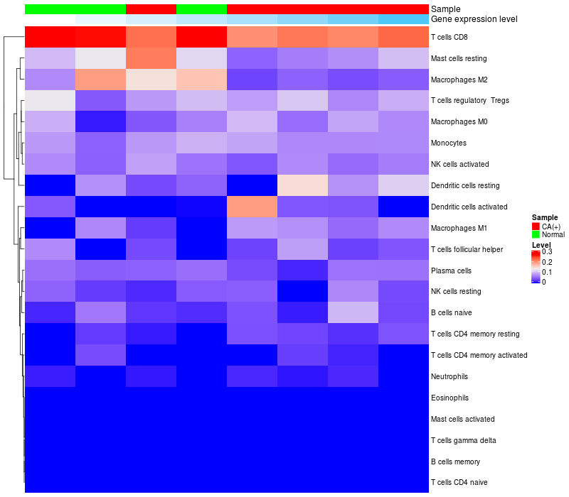 • Left: Heatmap of target gene expression and the level of various types of immune cells (cell type fractions) in all samples based on CIBERSORT method.