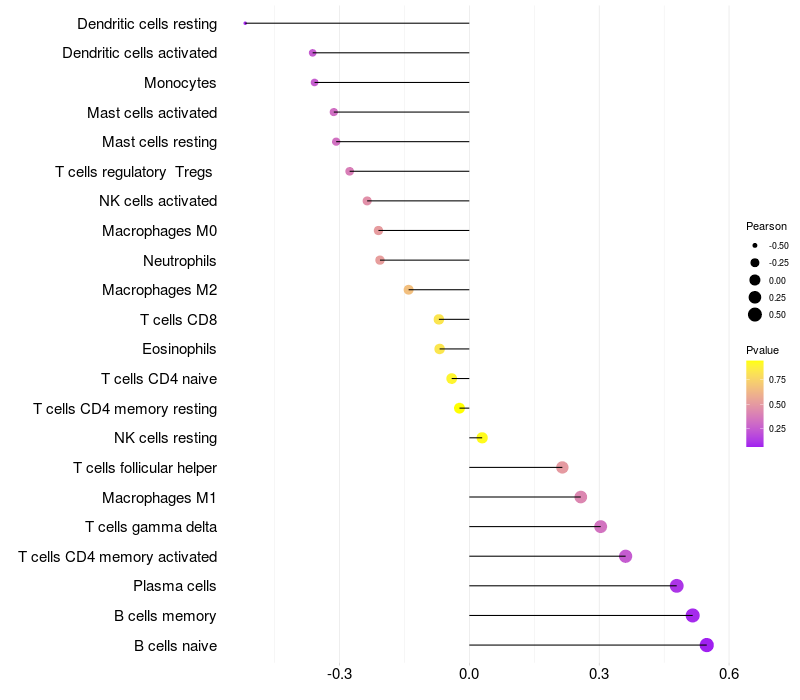 • Right: Correlation of target gene expression and the level of various types of immune cells in virus positive samples (Pearson Correlation Coefficient).