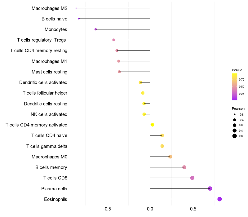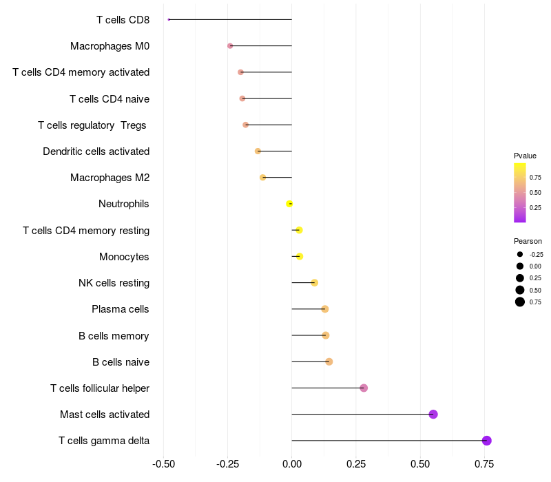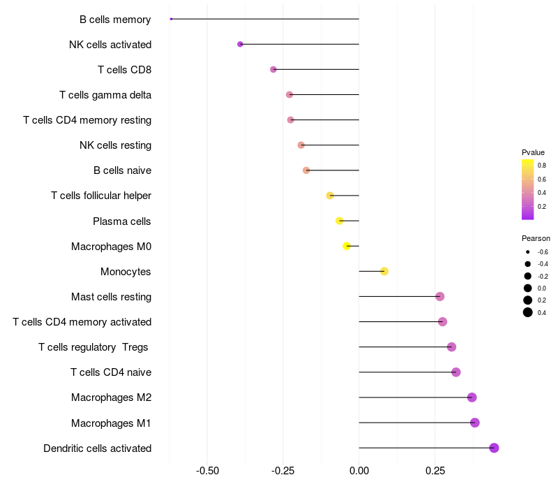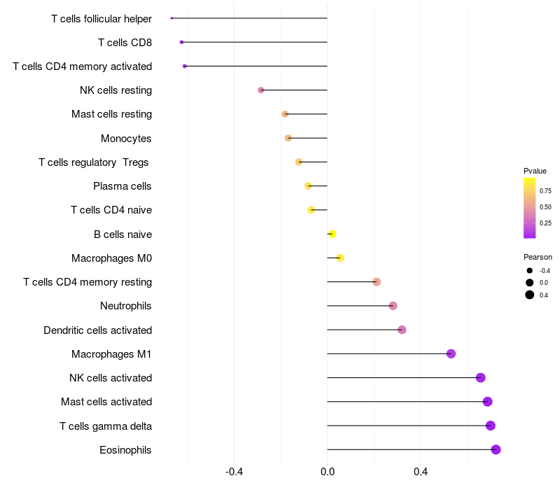 Lollipop of CCDC26 expression and immune infiltrating cell level correlation result in EBV+ samples