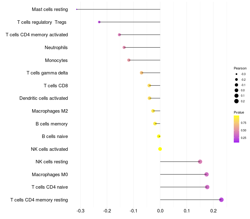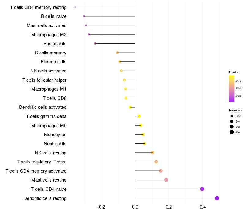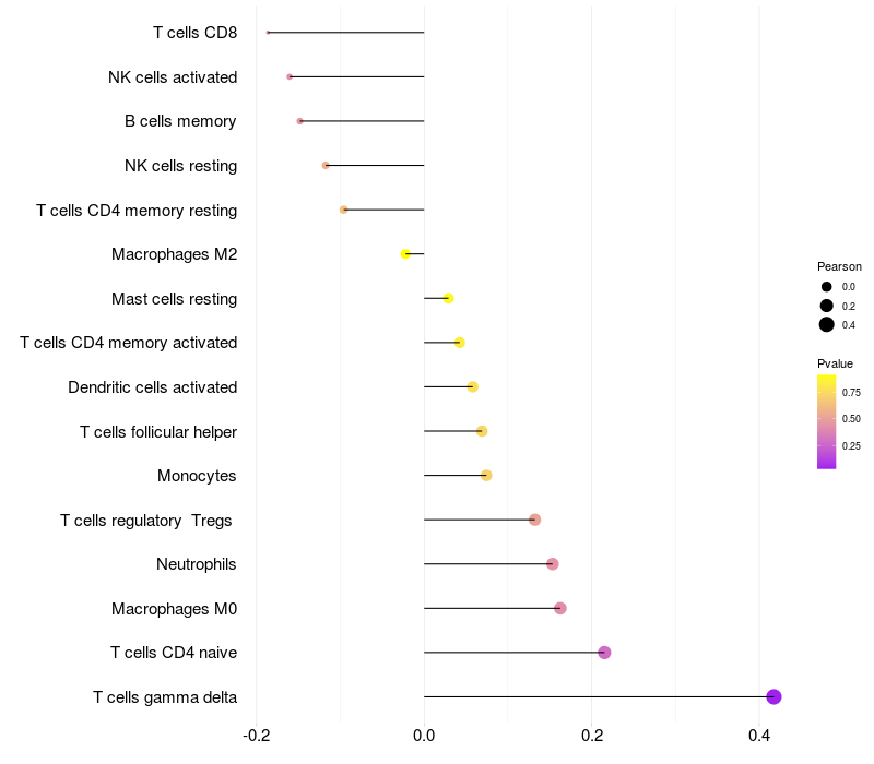 Lollipop of CCDC68 expression and immune infiltrating cell level correlation result in HTLV1+ samples